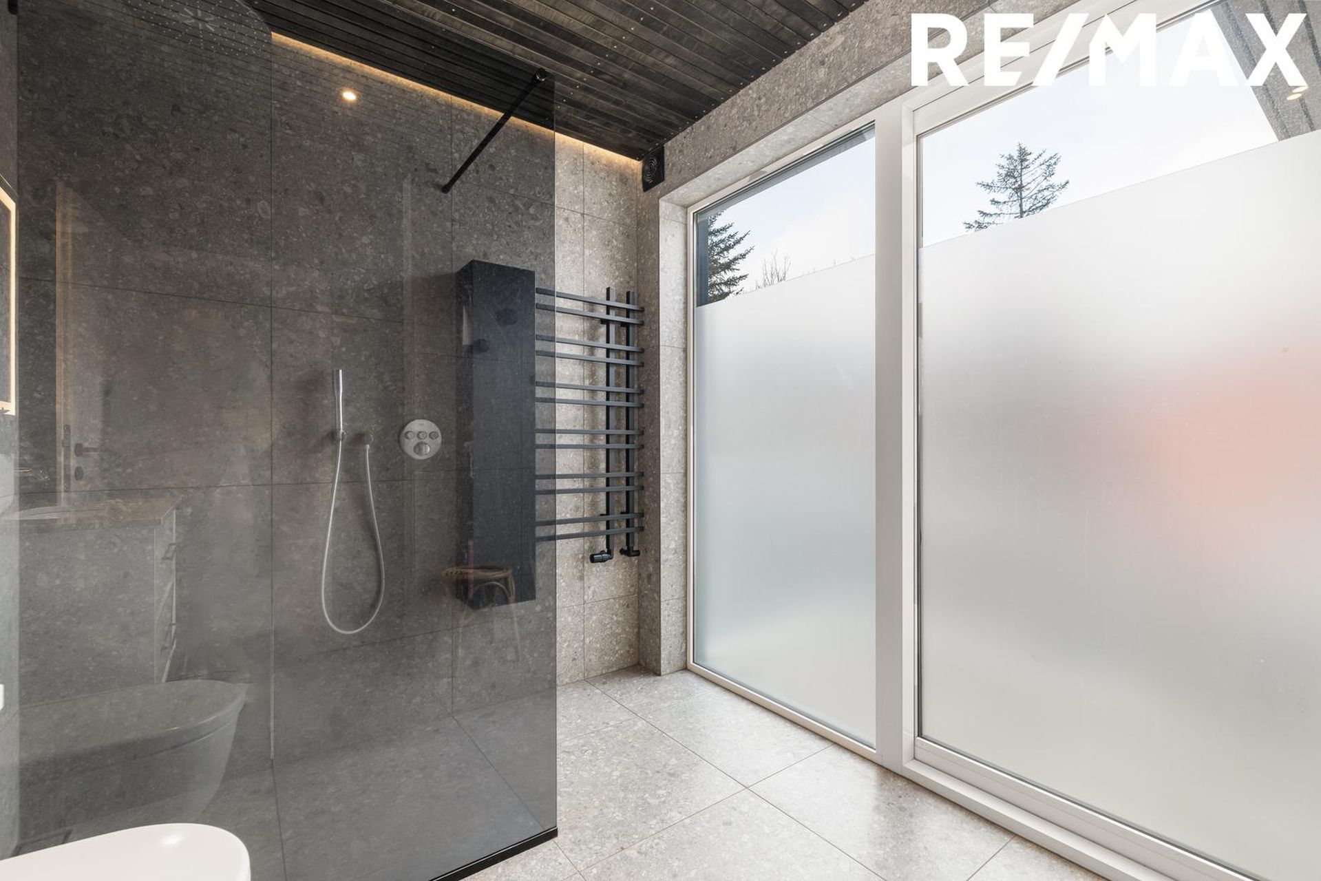 Baðherbergi: Fallegt baðherbergi, flísalagt hólf í gólf með 60x60 flísum, walk in sturta með innbyggðum blöndunartækjum, handklæðaofn og stór rennihurð sem liggur niður á pall.