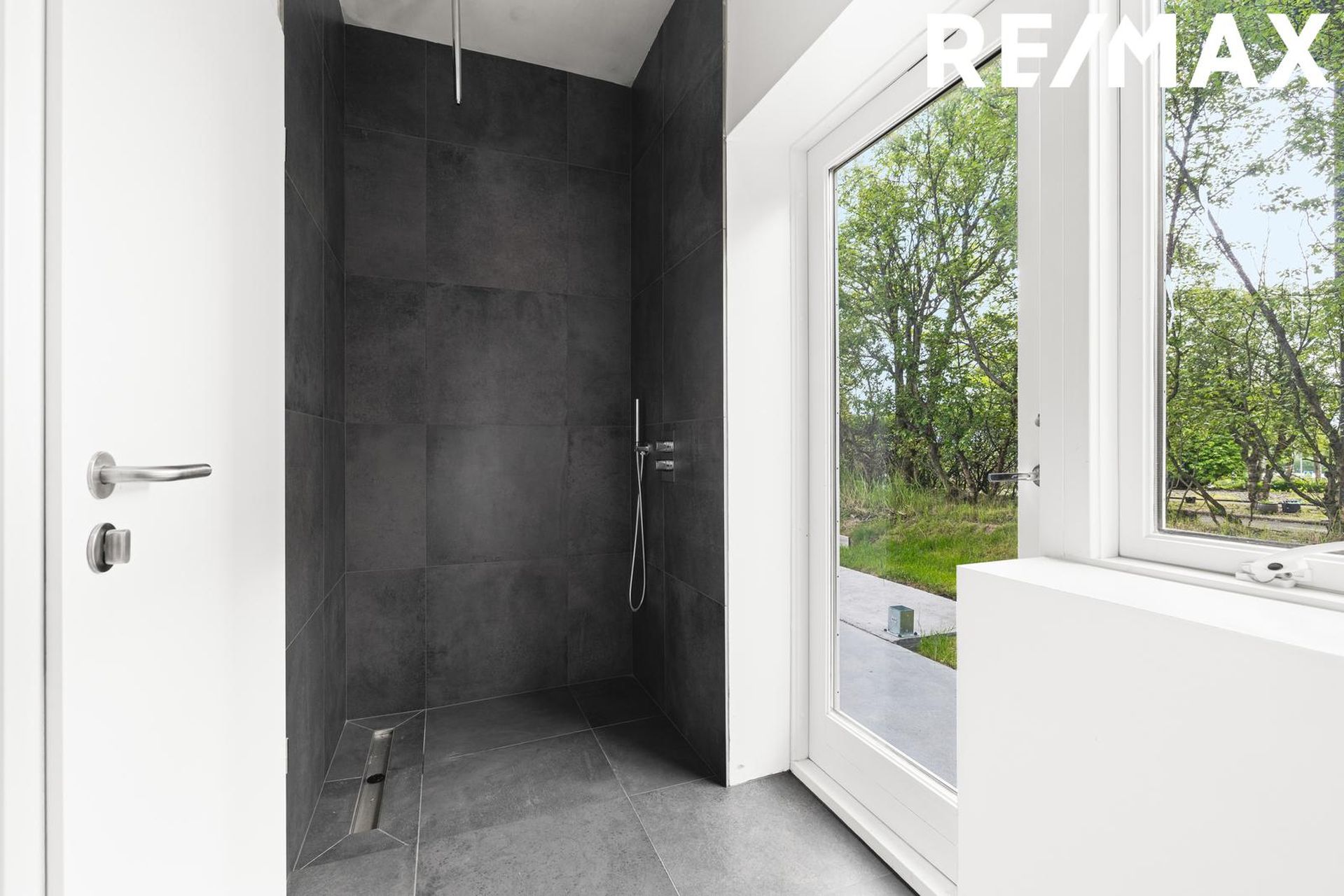 Baðherbergi: Er með rúmgóðri sturtu, upphengdu salerni, vaski með skúffum undir. Útgangur eru út í garð til austurs. Flísar ásamt hita í gólfi.