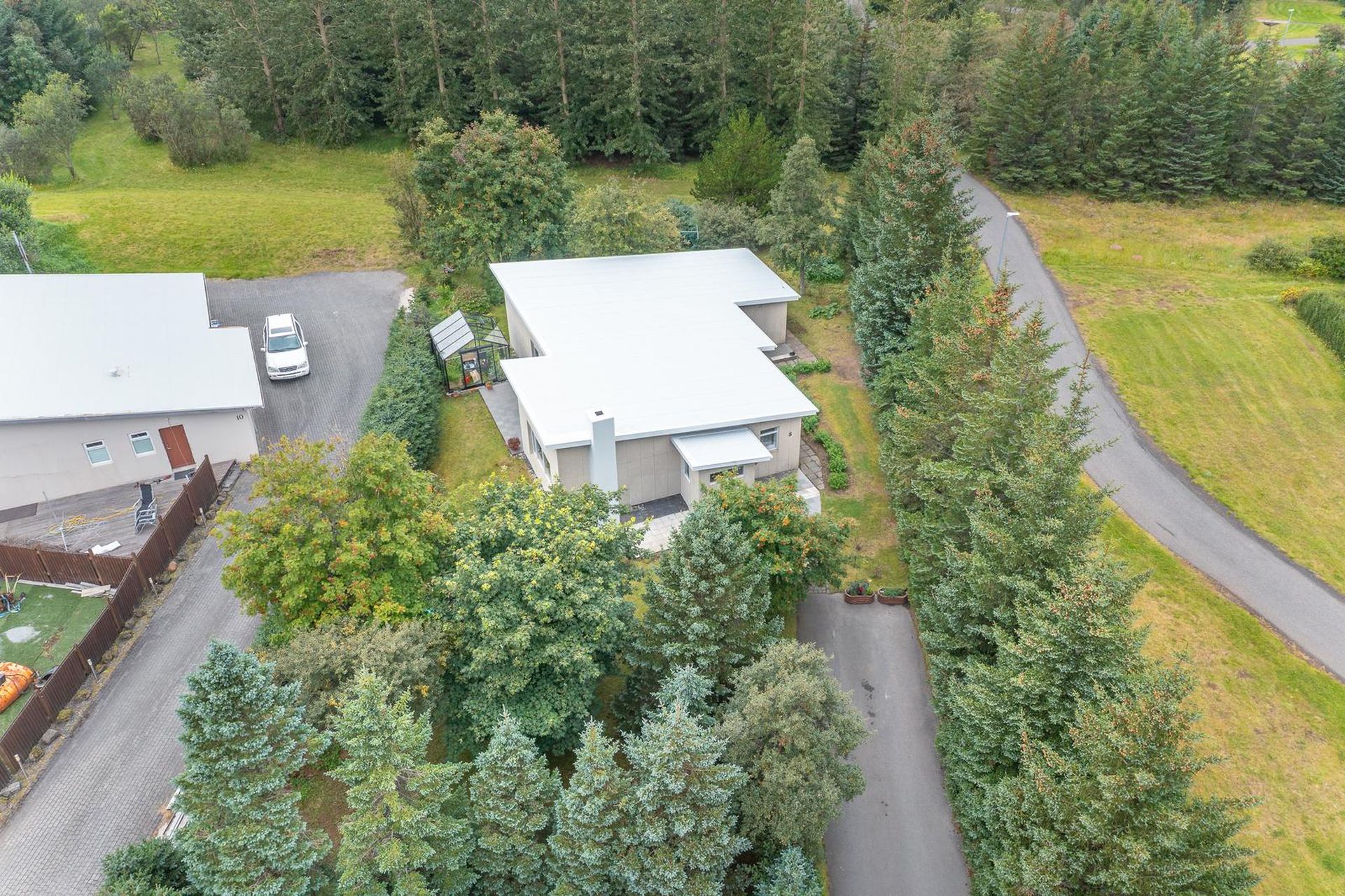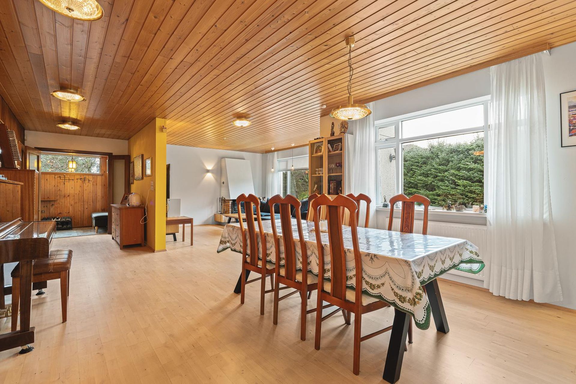 Stofan er með fallegum arni og útgengi út í garð. Samliggjandi er borðstofan. Flísalögð verönd og gróðurhús við húsið.