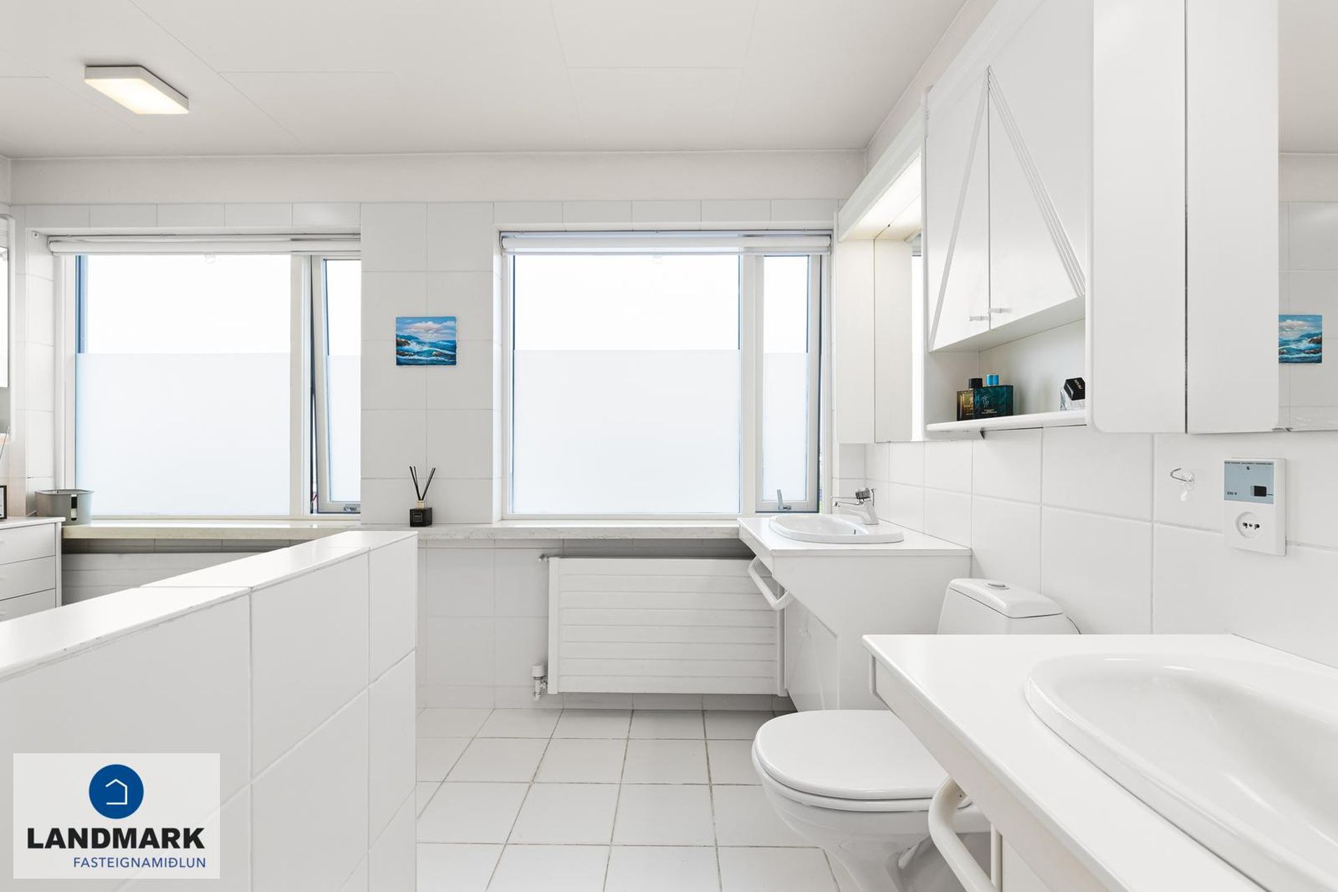 Baðherbergi: Afar rúmgott, flísar á gólfi og veggjum. Baðkar og flísalögð sturta. Falleg innrétting í kringum 2 handlaugar og góð snyrtiaðstaða með stórum speglum.