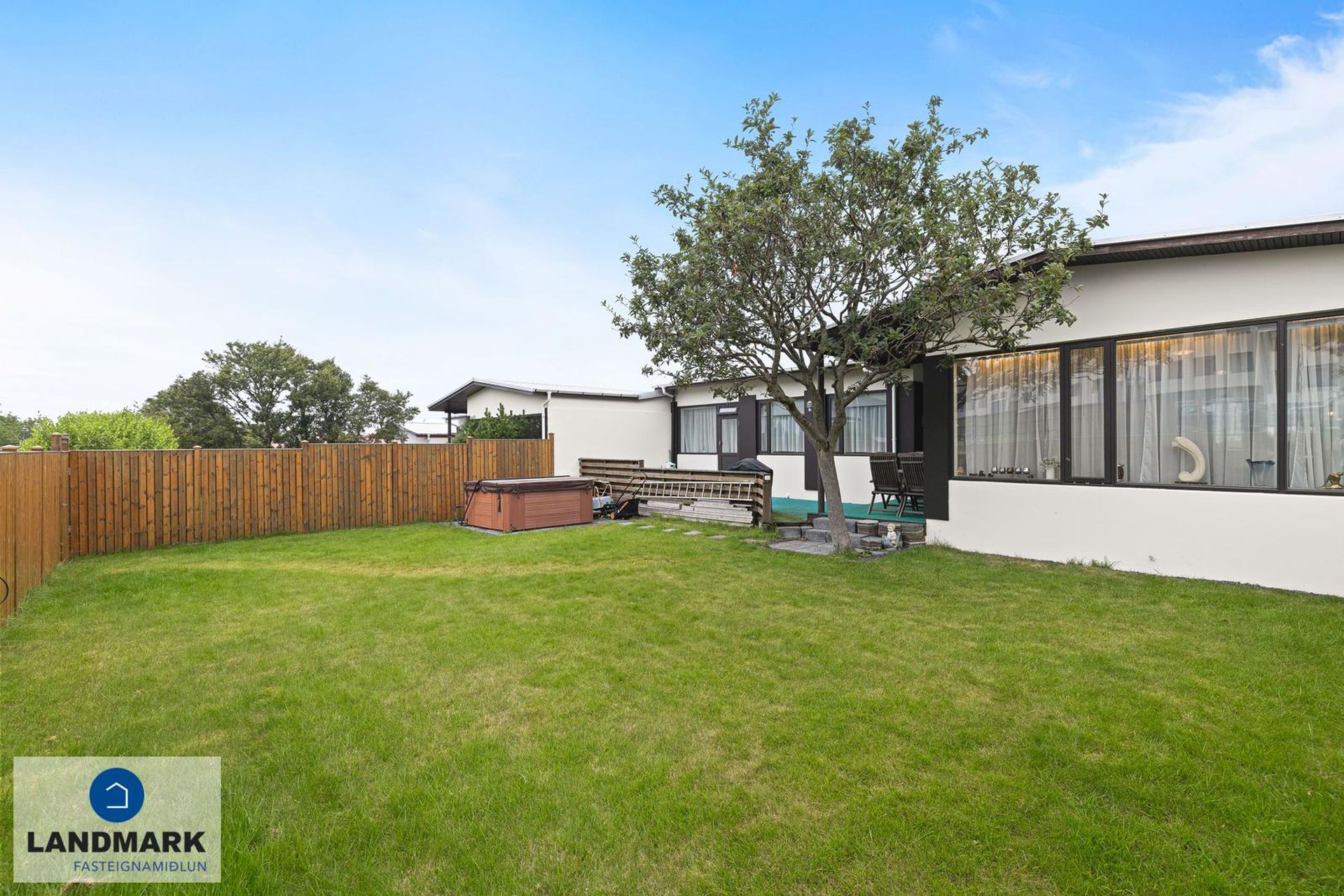 Miðrými / Sjónvarphol: Rúmgott með parket á gólfi, útgengt í afgirtan suðurgarð. Verönd með heitumpotti. Stór grasflöt.