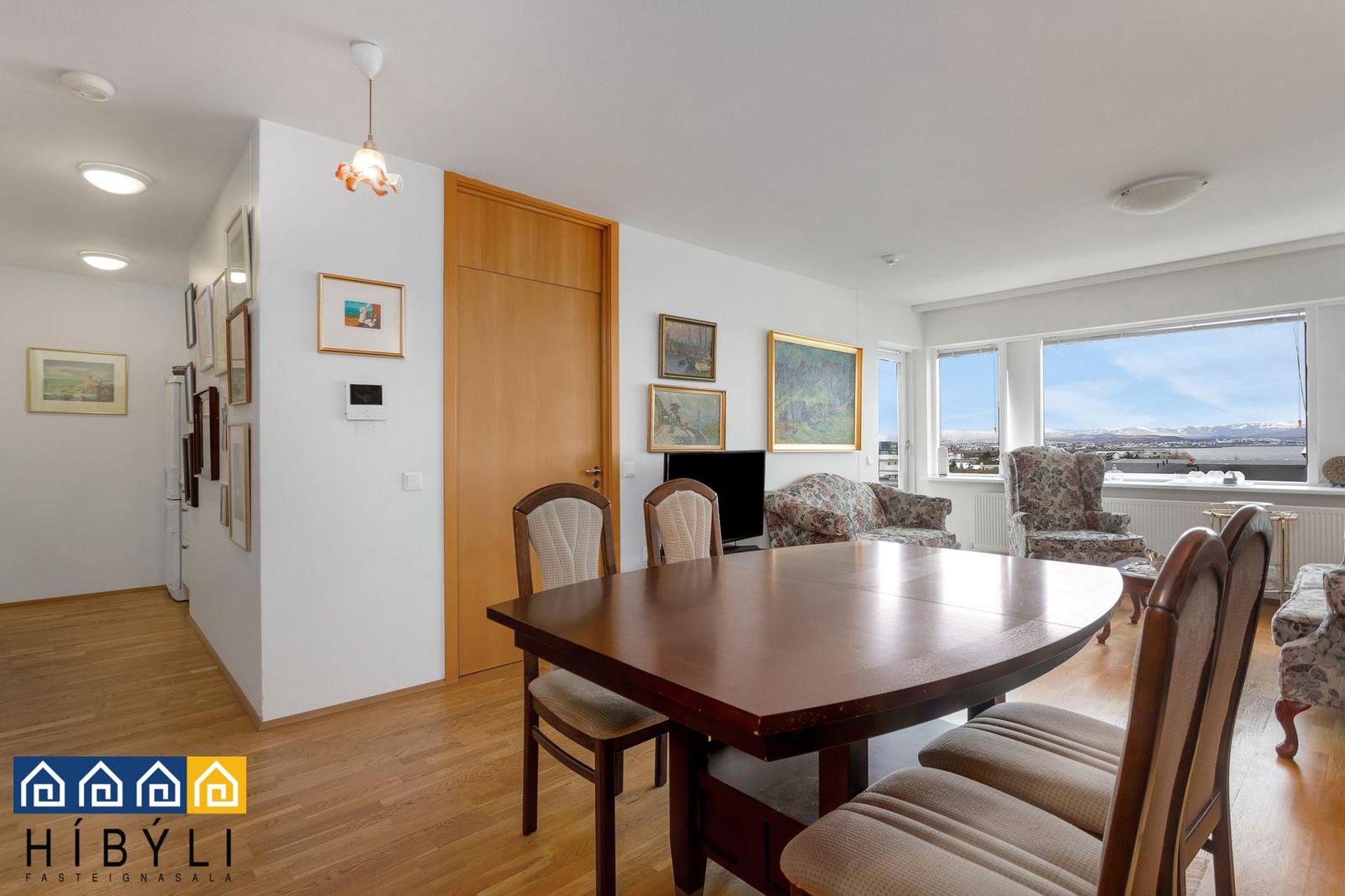 Setustofa: Rúmgóð stofa með parketi á gólfi, útgengt á stórar svalir sem snúa í suðvestur með fallegu útsýni yfir Reykjavík, Reykjanesskaga og Keili.
