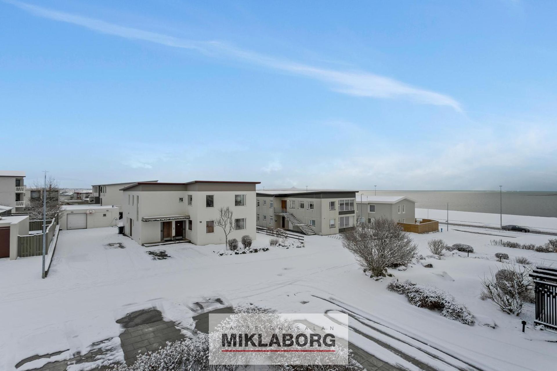 Komið inn í anddyri með fatahengi og þaðan gengið upp bogadreginn, steinsteyptan stiga upp á stigapall og þaðan gengið inn í lítið hol. Eldhús er með fallegri innréttingu, tengi fyrir uppþvottavél, innbyggður ísskápur og vönduð tæki. Stór gluggi er í eldhúsi með fallegu útsýni út á hafið. Stofan er björt og með mikilli lofthæð. Stofa skiptist í stofu og borðstofu, með útgengt á svalir í suð-austur. Baðherbergið er nýlega endurnýjað. Lítil falleg innrétting, upphengd salerni og sturta. Hjónaherbergi er rúmgott með fataherbergi. Gott barnaherbergi Bílskúr er frístandandi og með bæði rafmagni og hita. Inn af bílskúr er góð geymsla. Sér stæði eru framan við bílskúr og komast þar fyrir nokkrir bílar.