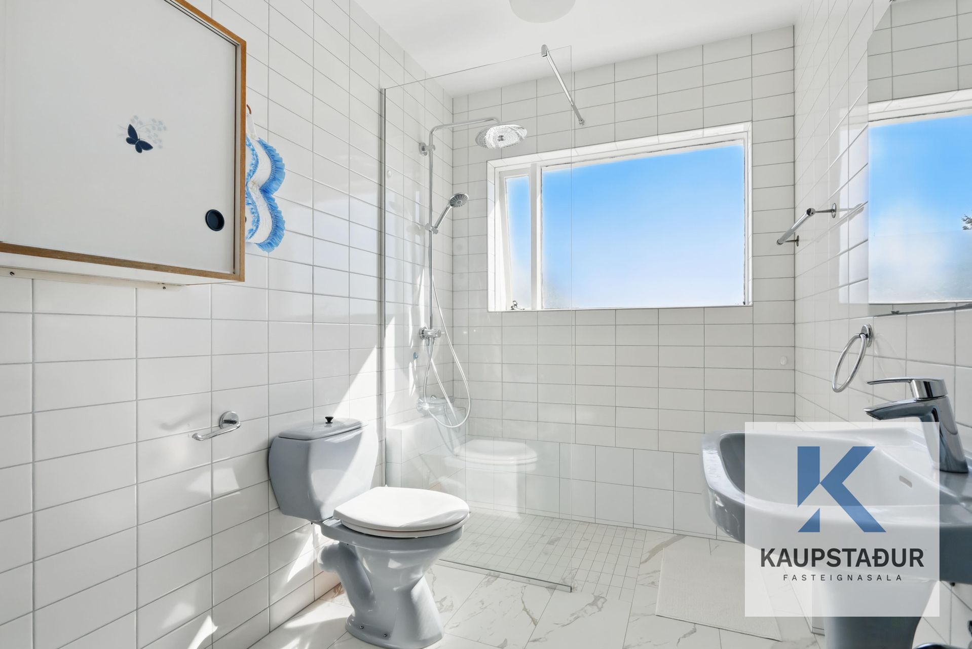 Salerni, flísalagt í hólf og gólf, vegghengt salerni, vaskur, gluggi.