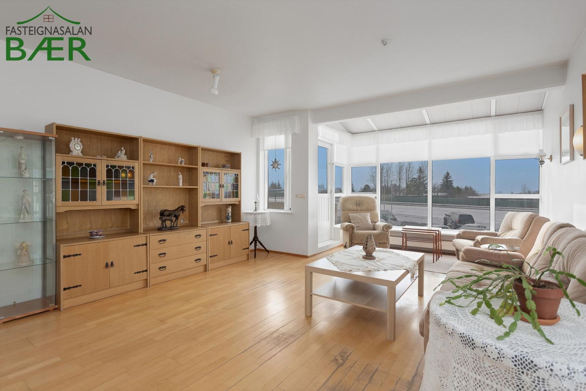 Komið er inn í rúmgóða forstofu með skáp. Frá forstofu er komið inn í hol. Þrjú rúmgóð svefnherbergi, tvö með skápum. Rúmgott baðherbergi með ljósri innréttingu og sturtuklefa, tengi fyrir þvottavél og þurrkara. Eldhús með eldri ljósri innréttingu á tvo vegu. Við hlið eldhúss er borðstofa / sólskáli. Rúmgóð og björt stofa með sólskála, útgengi frá stofu út á suður svalir. Á gólfum eignar er parket á holi, herbergjum, eldhúsi og stofu en flísar á baðherbergi og forstofu. Parket þarfnast endurnýjunar. Eigninni fylgir rúmlega 26 fm bílskúr með geymslu inn af. Um er að ræða bjarta og vel skipulagða eign á frábærum stað í Garðabæ.