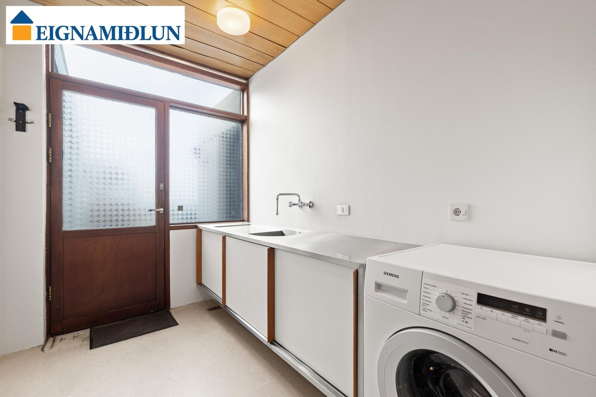 Þvottahús: Inn af eldhúsi er rúmgott þvottahús með innréttingu og útgengi í bakgarð og að bakinngangi að bílskúr.
