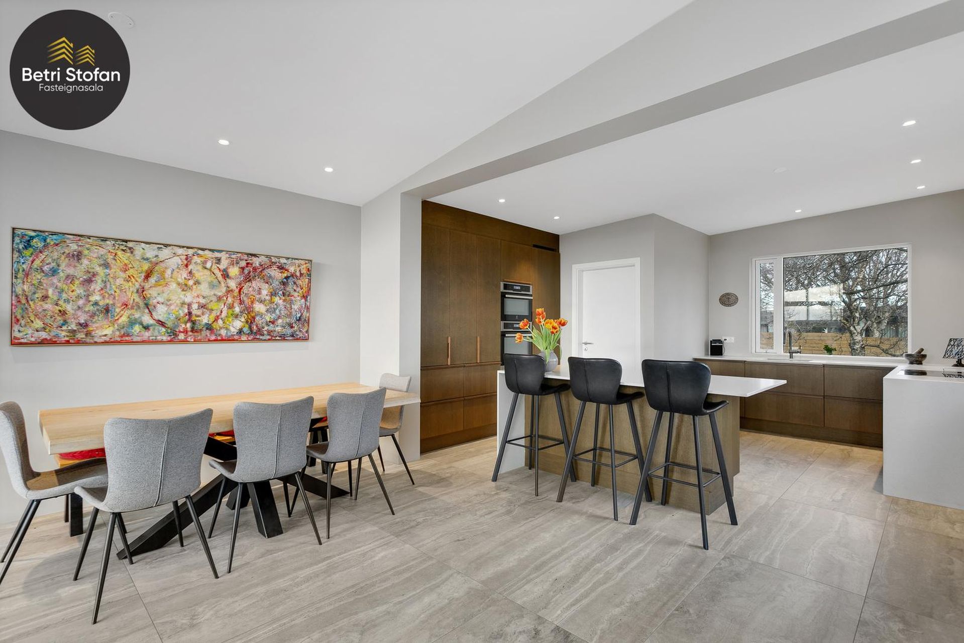 Stofa: Stór og björt með stórum gluggum og hátt til lofts, flísar á gólfi. Útgengi út á suðurpall. Gólfhiti