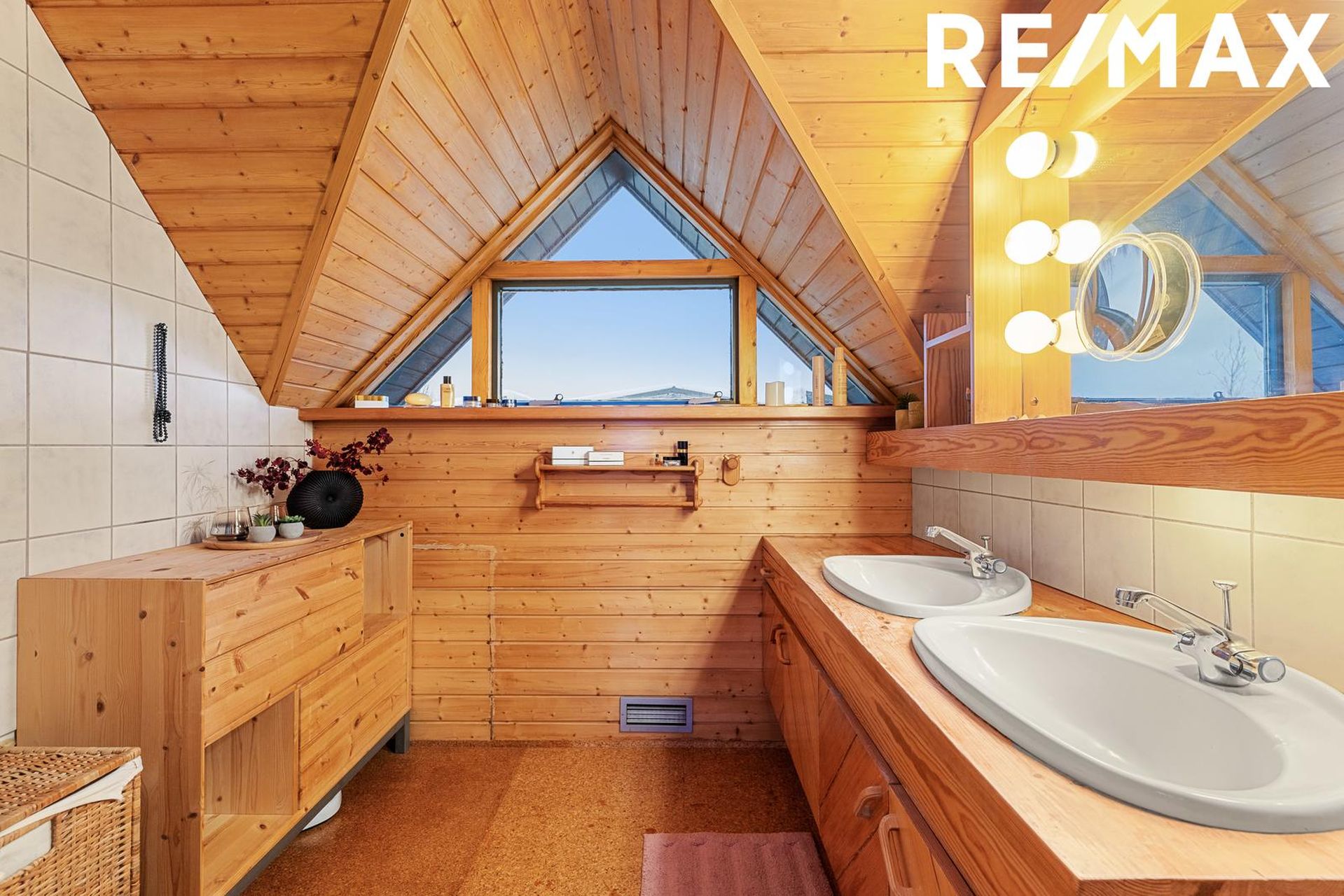 Baðherbergi: Er með viðar innréttingu með tveimur vöskum, sturtuklefa, timburklædda veggi að hluta, flísar að hluta, dúk í sturtunni, kork á gólfi og glugga með opnanlegu fagi. Góð lofthæð er inni á baðherberginu.