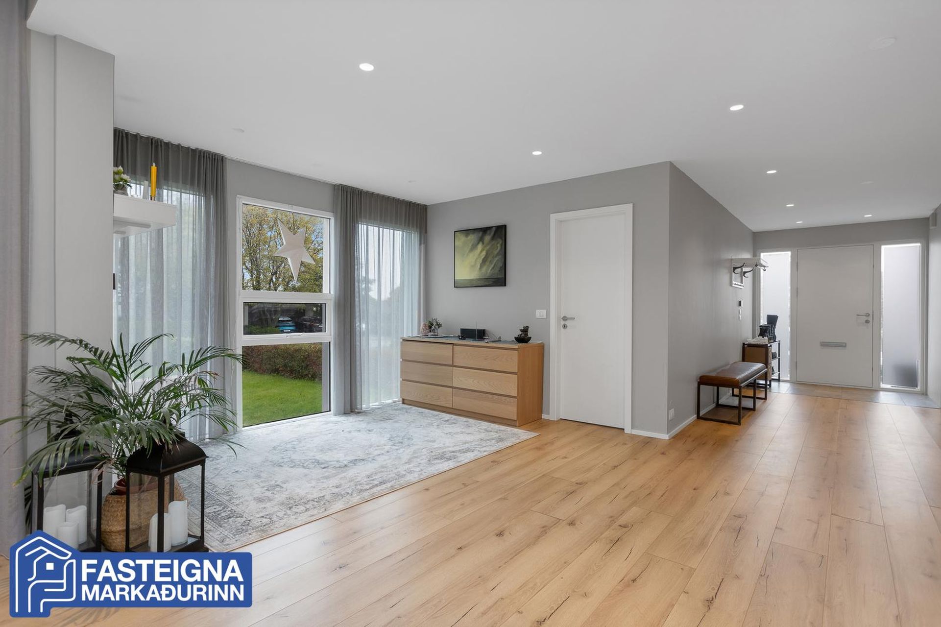 Þvottaherbergi, stórt með glugga, flísalagt, góð innrétting með vaski og vinnuborði, handklæðaofn og útgengi á lóð.
