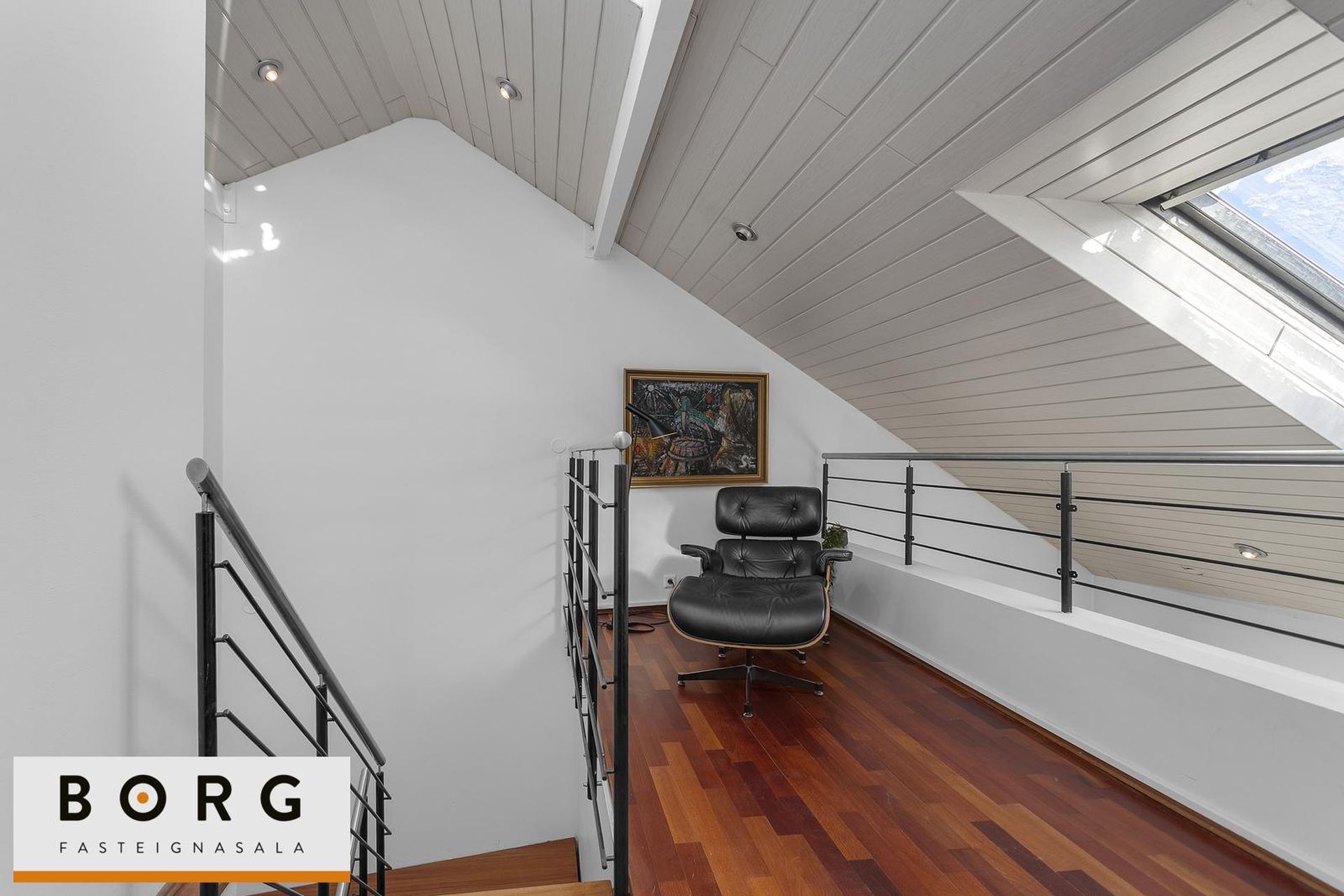 Nánar: Gengið er inn um sérinngang á jarðhæð og komið inn í anddyri með flísum á gólfi. Á aðalhæð íbúðarinnar (2. hæð) eru eldhús, borðstofa og stofa með aukinni lofthæð, baðherbergi og tvö svefnherbergi. Eldhús með flísum á gólfi og innréttingu með steinplötu á borðum, gott borðpláss og eyja. Skápar neðan borðplötu, vaskur felldur í borðplötu, helluborð í borðplötu og háfur fyrir ofan. Gólfsíðir skápar til hliðar, innbyggður ísskápur og innbyggð uppþvottavél, ofn í vinnuhæð. Borðstofa með flísum á gólfi og samstæðri innréttingu við eldhús. Stofa með parketi á gólfi og útgengi út á svalir. Baðherbergi sem er nýuppgert og flísalagt hólf í gólf, hiti í gólfi. Upphengt salerni með innbyggðum kassa og handklæðaofn. Innrétting undir handlaug ofan á borðplötu og stór baklýstur spegill fyrir ofan, gólfsíðir skápar til hliðar. "Walk in" sturta með vönduðum innbyggðum tækjum, stórum sturtuhaus og glerskilrúmi. Hjónaherbergi með parketi á gólfi og stórum fataskáp með lýsingu fyrir ofan, frá herberginu er útgengi út á svalir sem snúa að sameiginlegum bakgarði hússins. Barnaherbergi með parketi á gólfi með útgengi út á svalir. Á rishæð eru tvö svefnherbergi með parket á gólfi og baðherbergi með flísum á gólfi, sturtu, handklæðaofni og tengi fyrir þvottavél. Í kjallara er fjölskylduherbergi með parketi á gólfi, inn af herberginu er stór geymsla þaðan sem gengið er inn í bílageymslu.