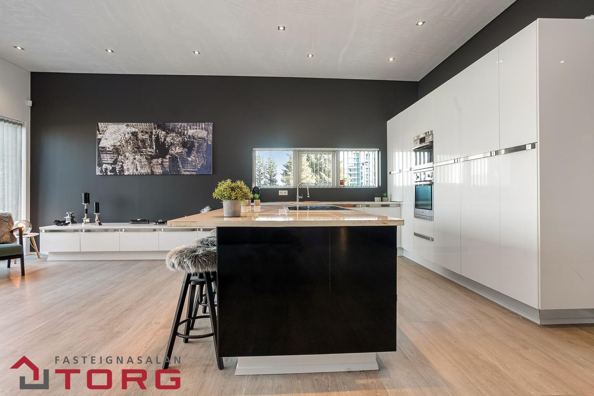 Stofa, borðstofa og eldhús eru í 95 fm opnu, björtu rými með einstaklega góðri lofthæð. Eldhús með hvítri innréttingu og með, svartri stórri eyju með steinplötu. Ofnar eru í vinnuhæð og ísskápur og uppþvottavél eru innbyggð.