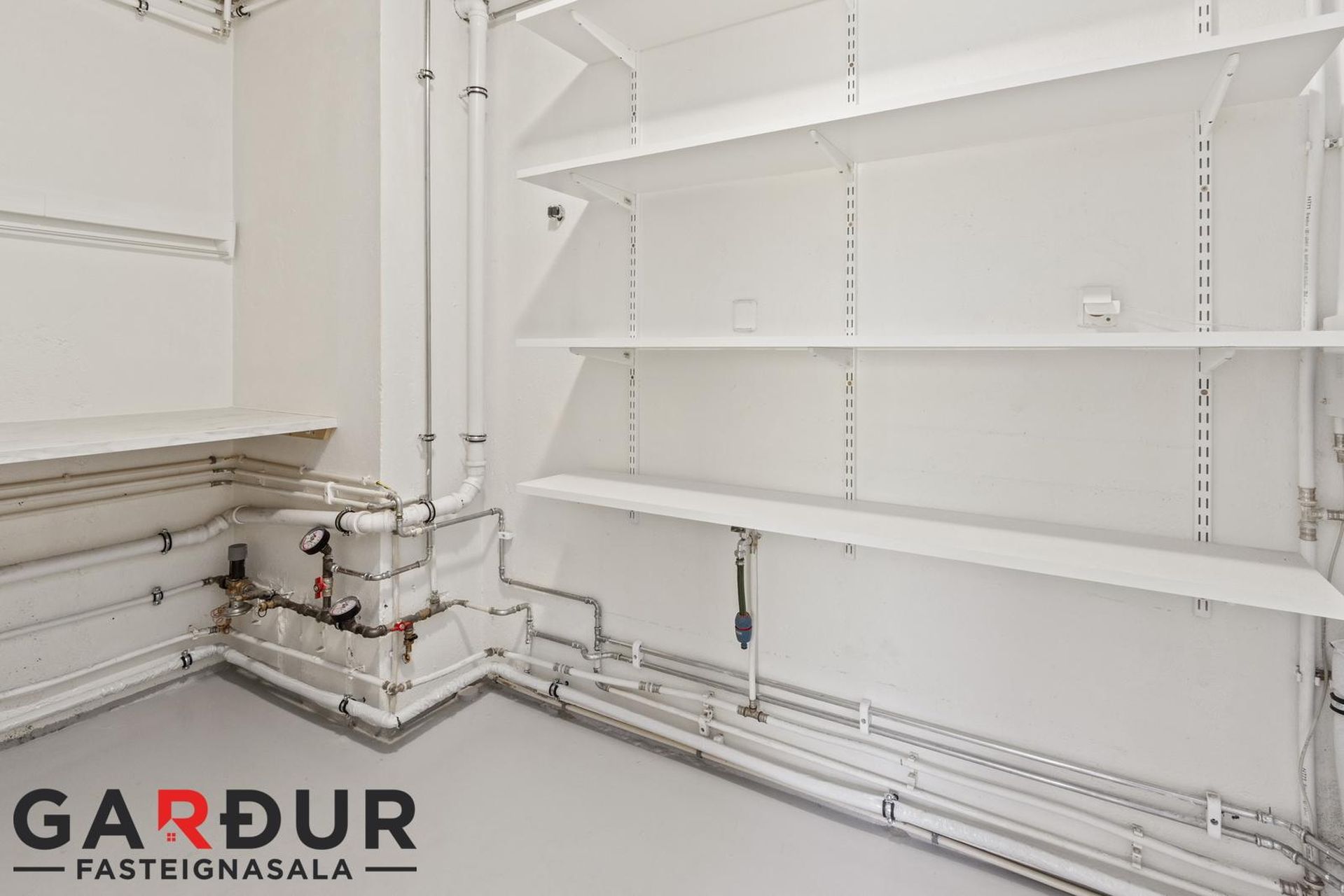 Þvottahús: Gott þvottahús með hvítri innréttingu þar sem er pláss fyrir þvottavél og þurrkara í vinnuhæð. Þvottahúsgólf flotað og IKEA innrétting sett upp 2024.