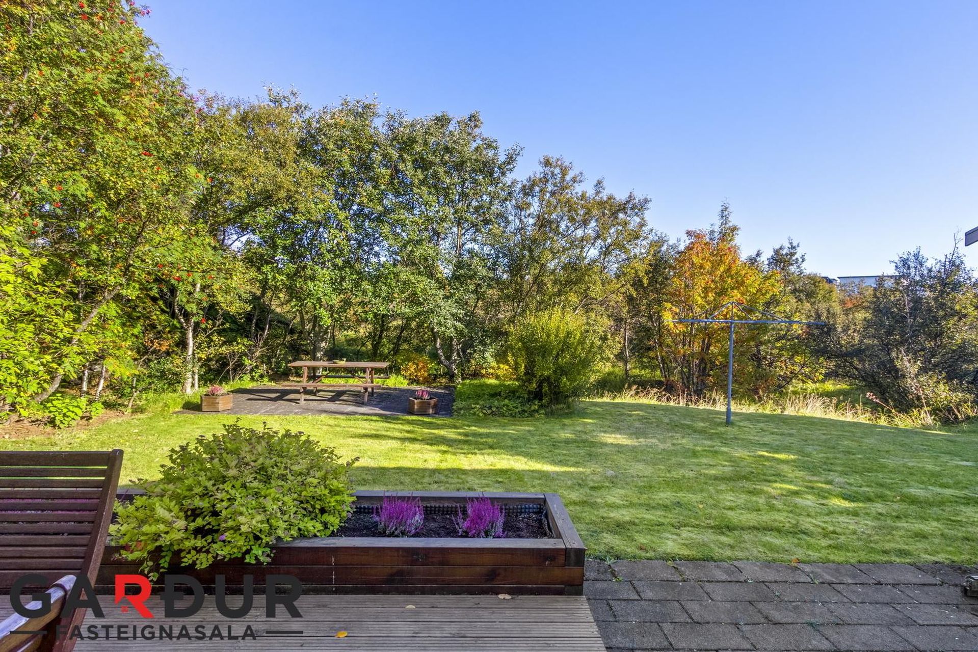 Á baklóð er fallegur garður ásamt ca 10 fm geymsluskúr, búið er að leggja rafmagn að honum og er olíuofn notaður sem kynding. Falleg timburverönd, hellulögð stétt og gras að hluta en svo gengur hraunið inn í lóð að hluta en þar er landið ósnert og engin byggð.