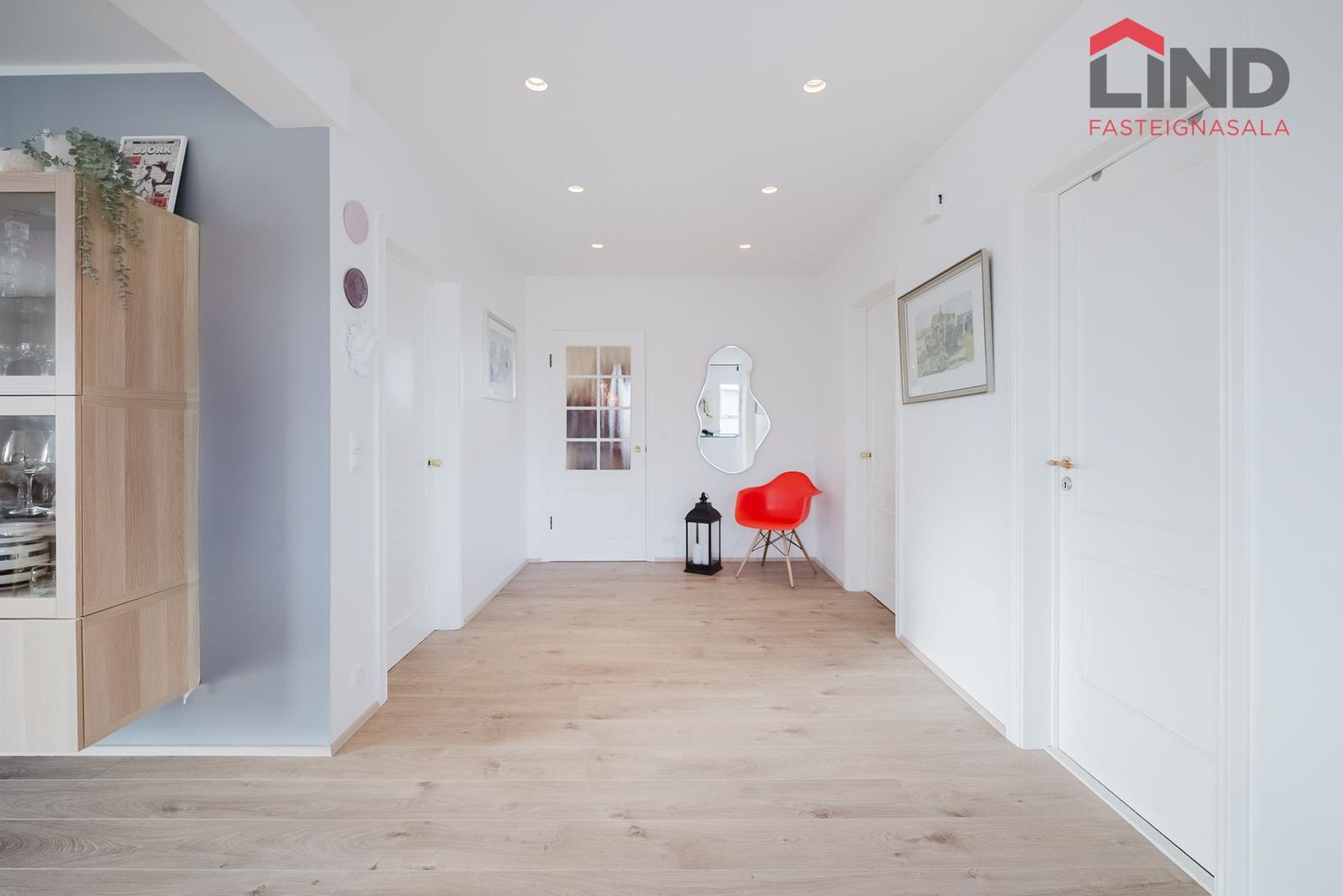 Rúmgott miðrými tengir saman íbúðina með óslitnu ljósu parketi og innfelldri halogen lýsingu.