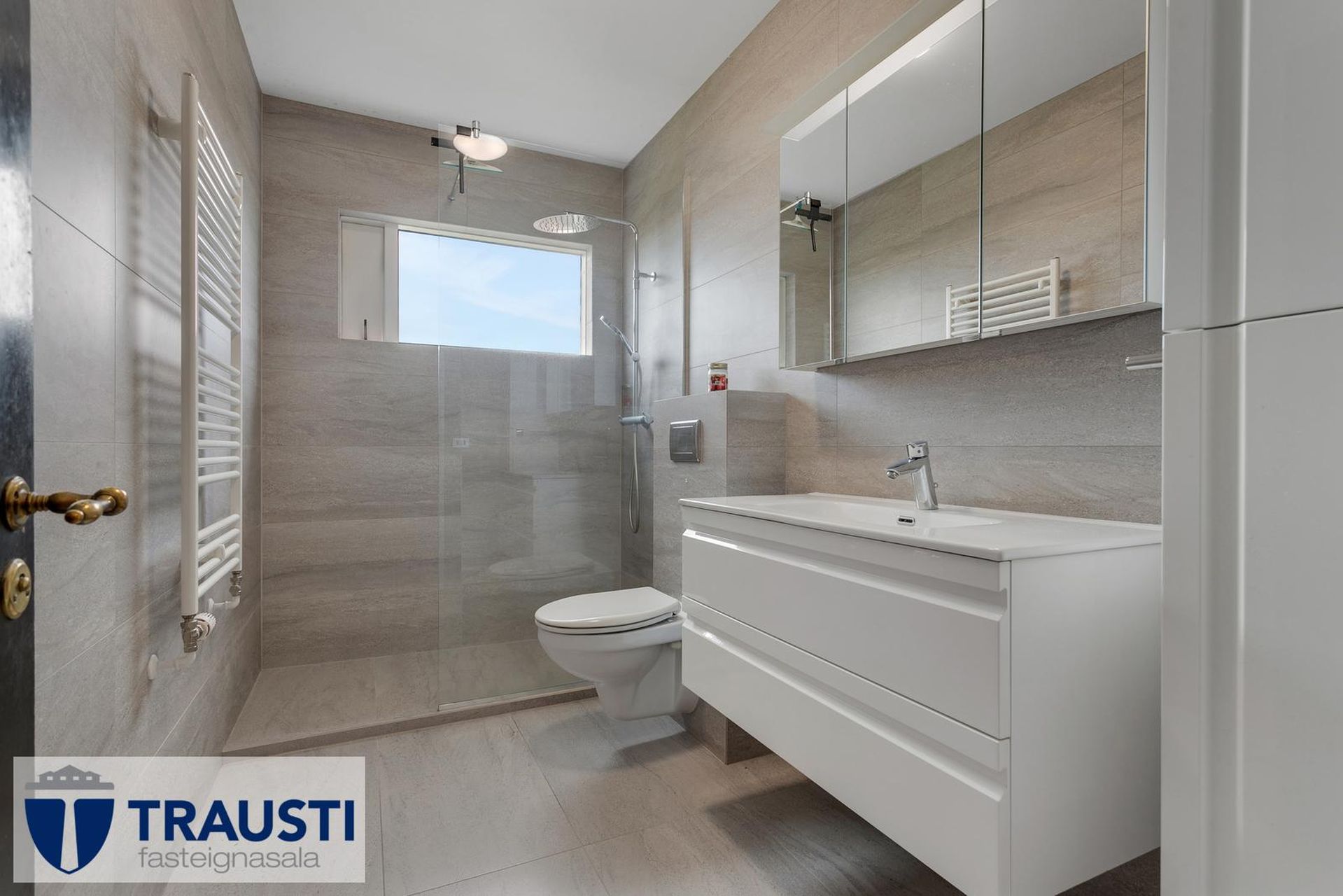 Baðherbergi var endurnýjað 2022 og er flísalagt í hólf og gólf. Góð "walk-in" sturta, inrrétting, handklæðaofn, upphengt salerni og gluggi.