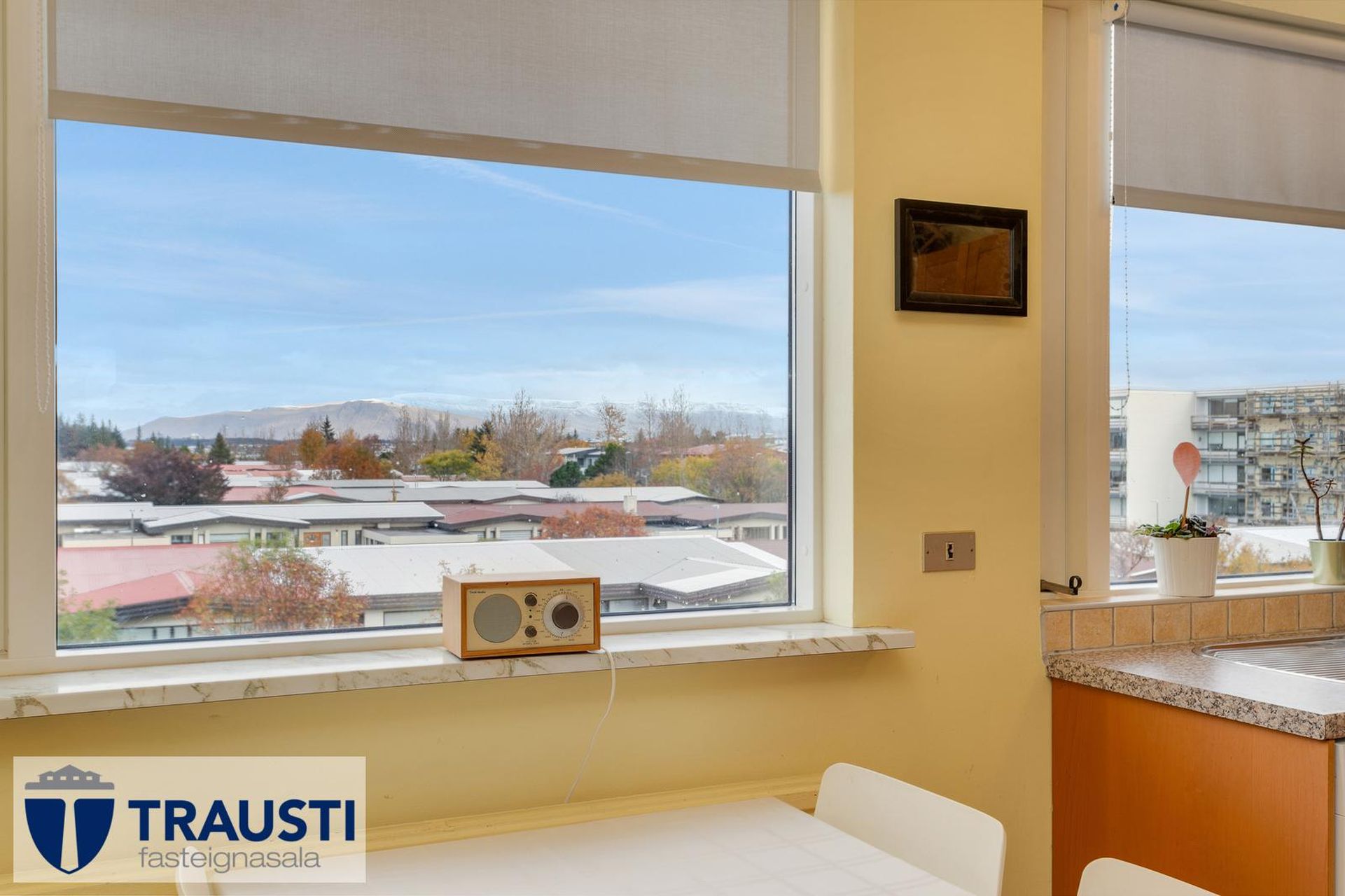 Eldhús er rúmgott með kork frá Þ.Þorgrímsson á gólfi. Tengi fyrir uppþvottavél og vifta yfir eldavél. Fallegt útsýni til norðurs.