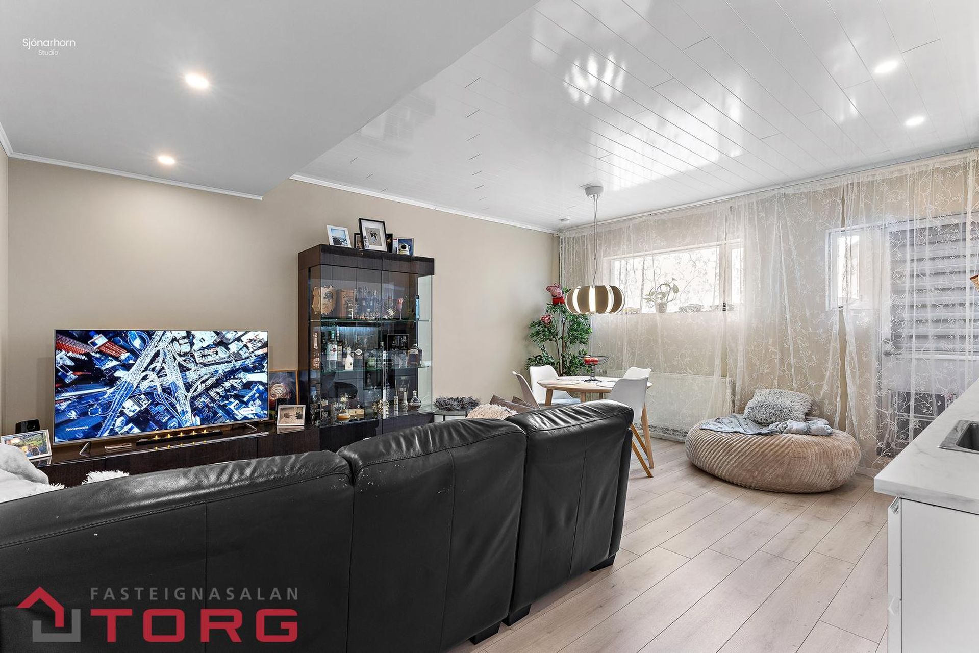 Alrými er rúmgott og telur stofu, borðastofu og eldhús, parket á gólfi