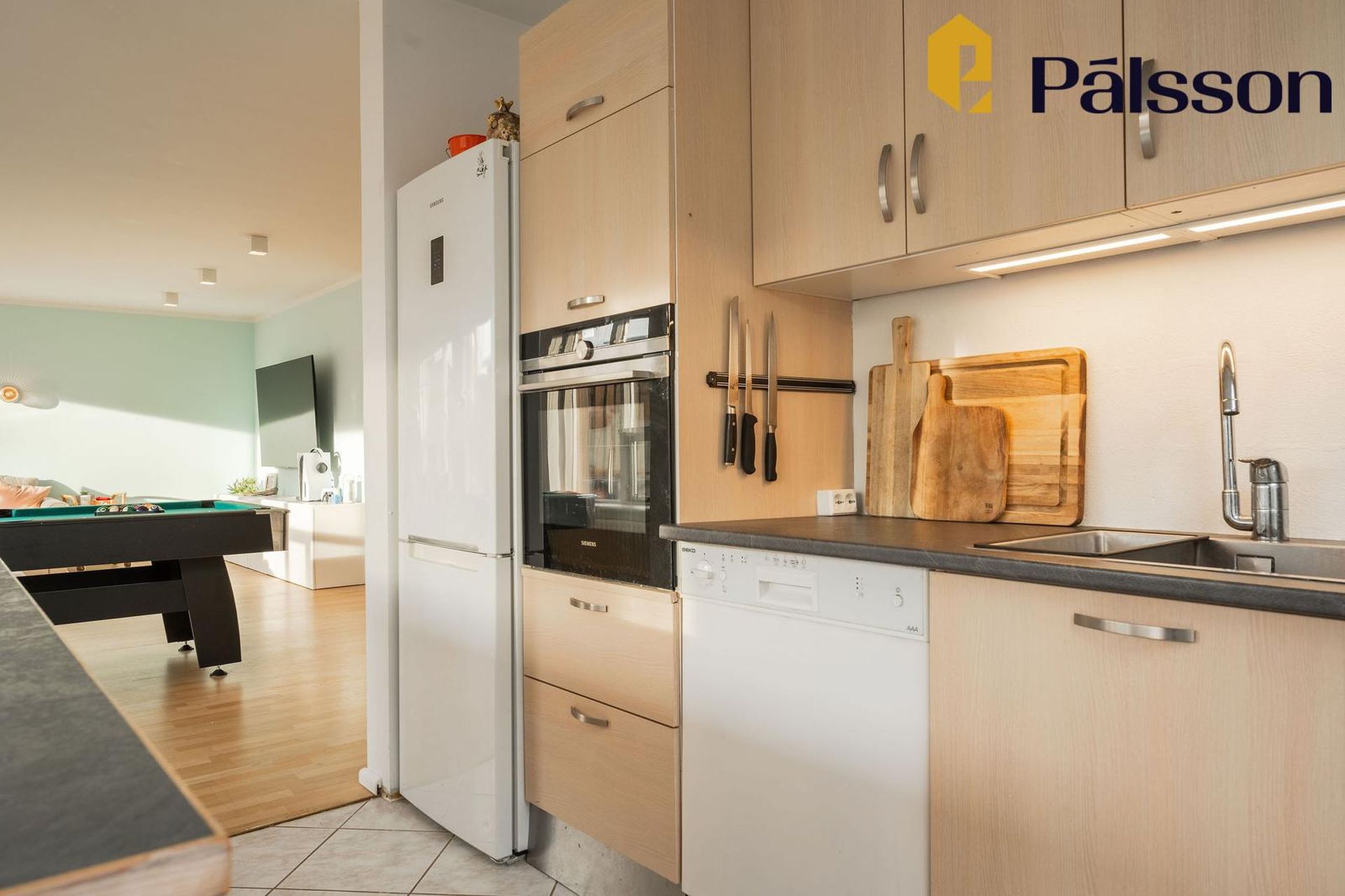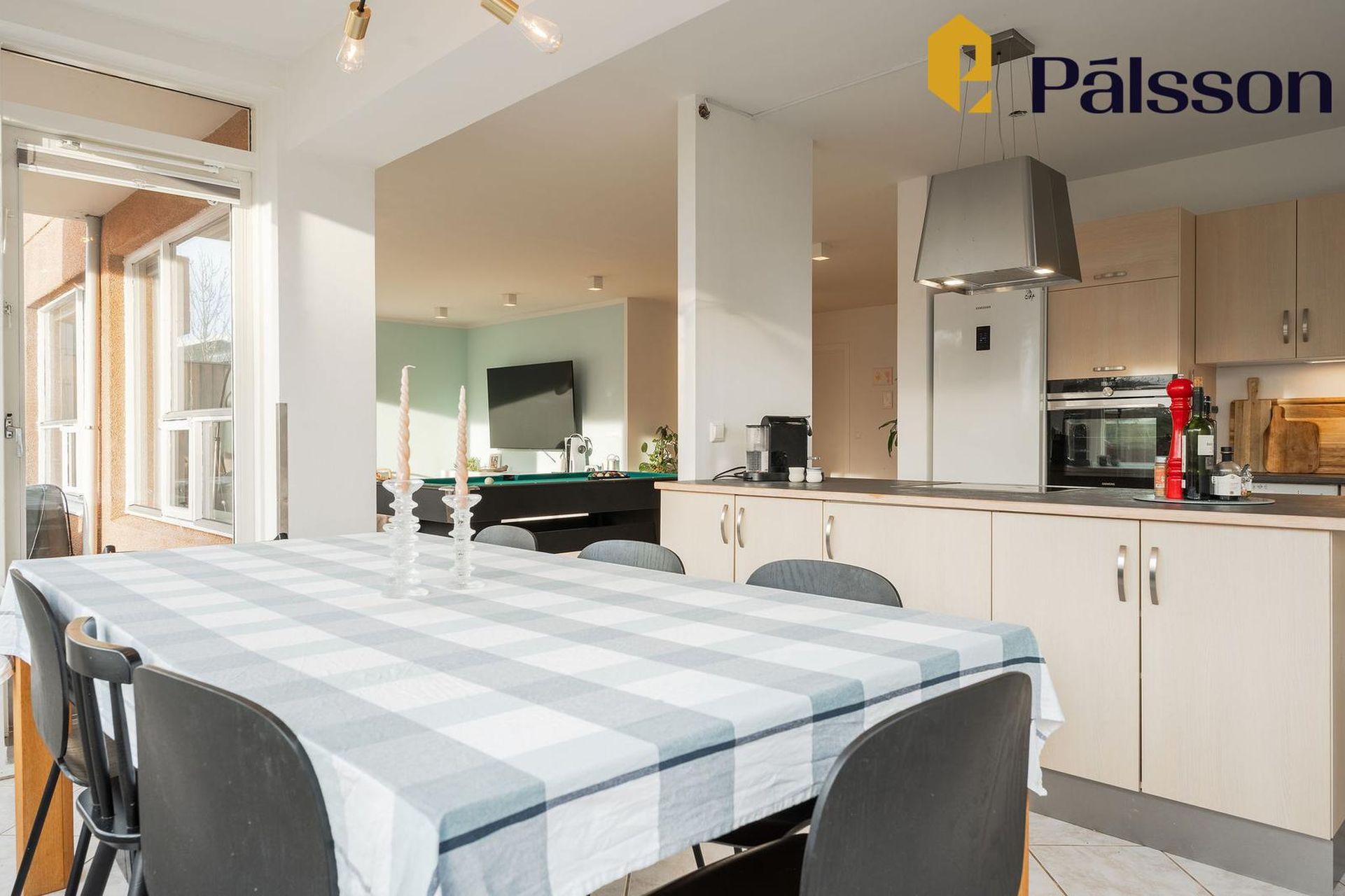 Eldhús: Eldhús og stofa í björtu og rúmgóðu alrými með útg. á ca 50 fm sólpall. Á sólpallinum er geymsluskúr fyrir grill og húsgögn. Eldhúsið er með viðarinnréttingu, ofn í vinnuhæð, eyja með helluborði og háf yfir.