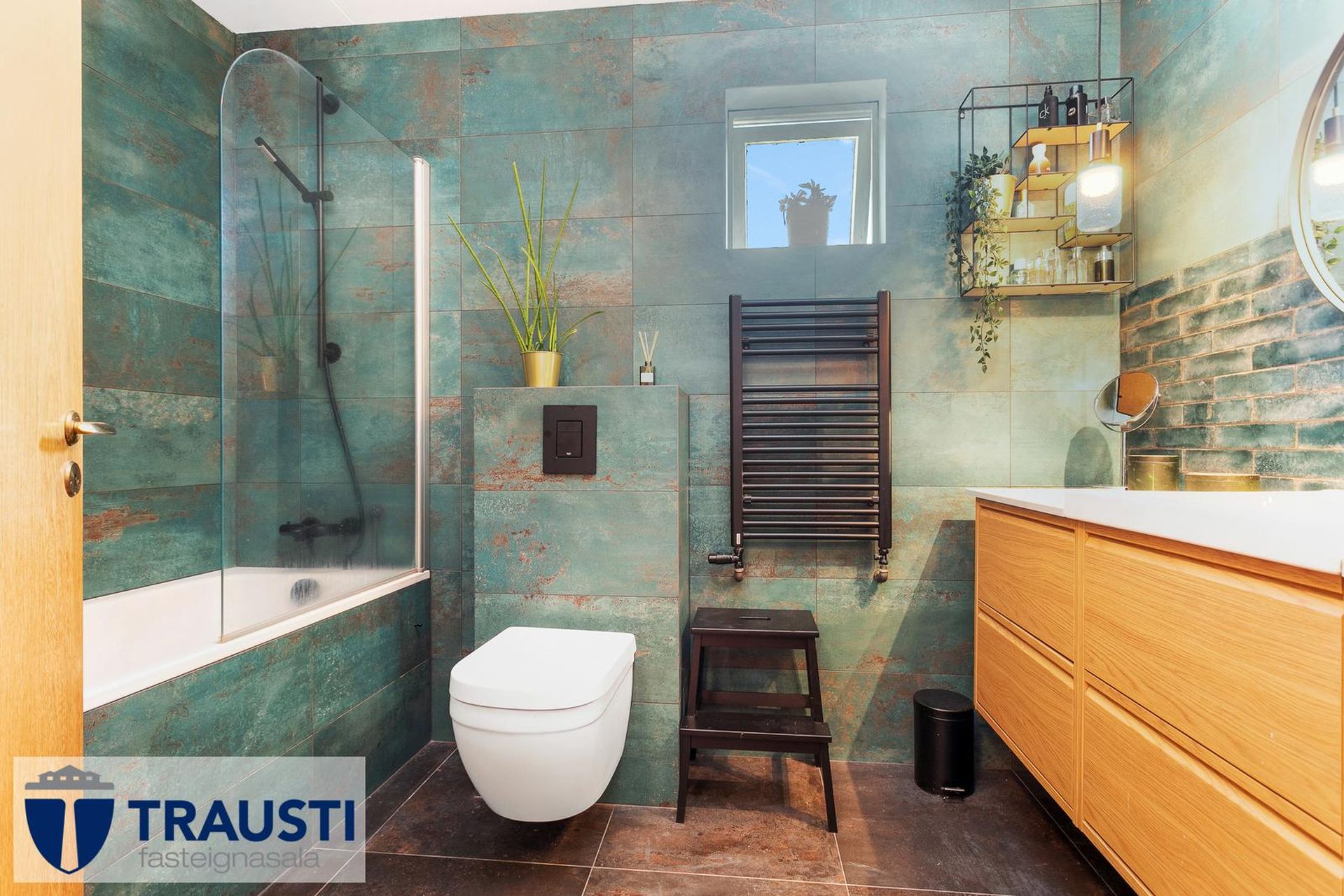Baðherbergi er með baðkari með sturtu yfir, vegghengt salerni, handklæðaofn og flísar á gólfi og veggjum.