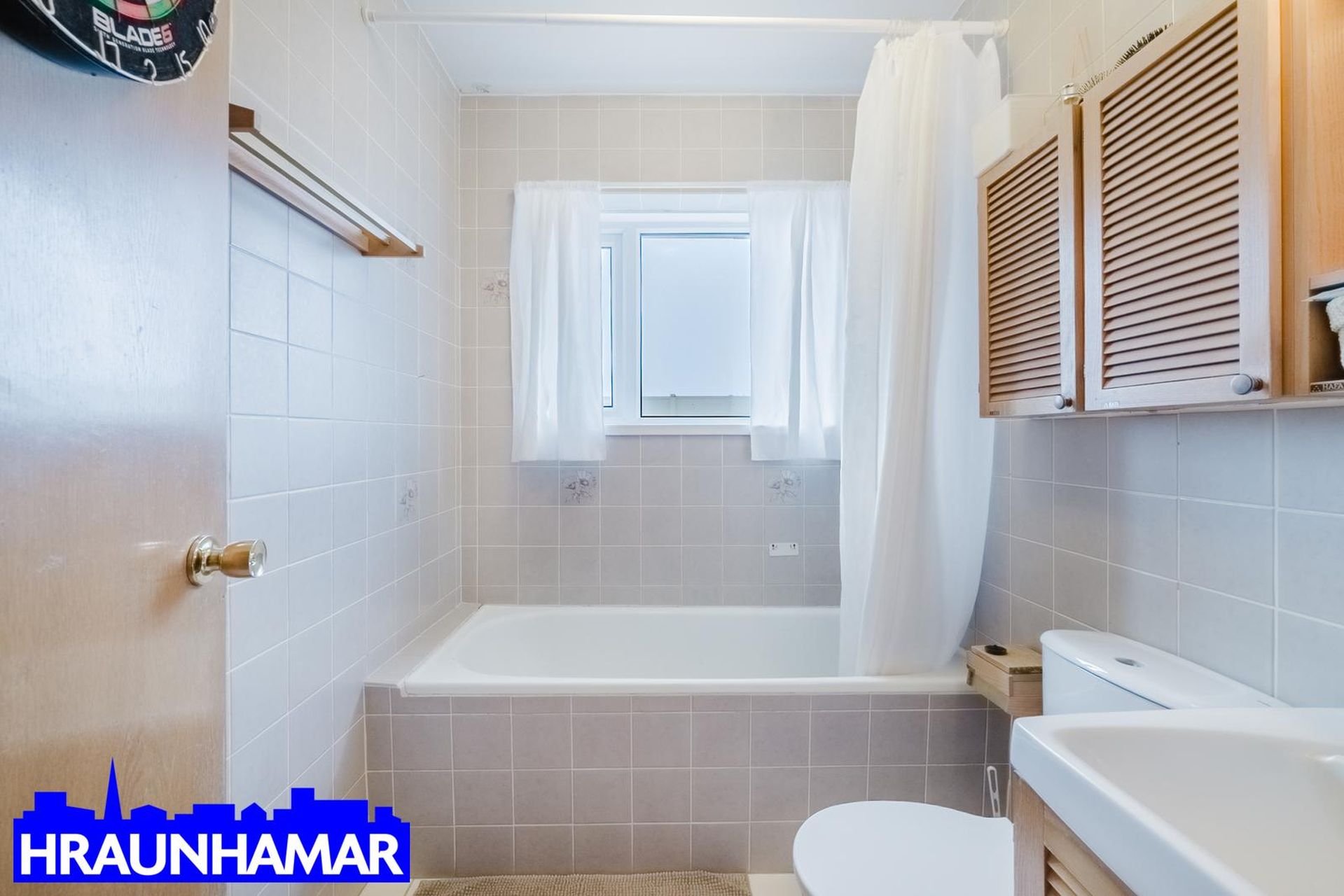 Þvottahús, flísalagt með glugga.
