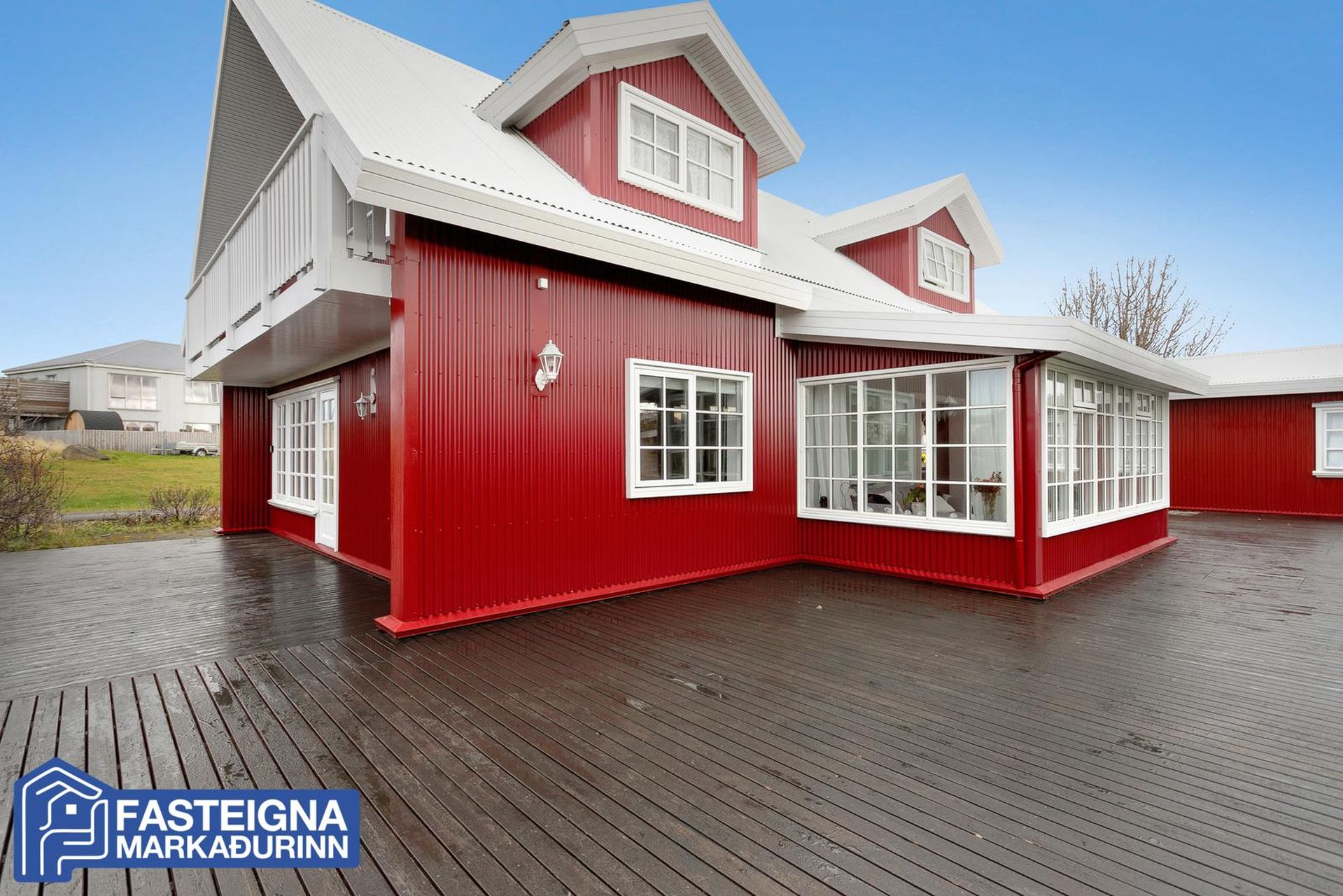 Að innan er húsið virkilega vel skipulagt og mikil lofthæð er á efri hæð þess þar sem eru þrjú svefnherbergi, sjónvarpsstofa og baðherbergi. Á neðri hæð eru m.a. 2 svefnherbergi, eldhús, stofa, borðstofa, sólstofa og þvottaherbergi ásamt gestasnyrtingu.