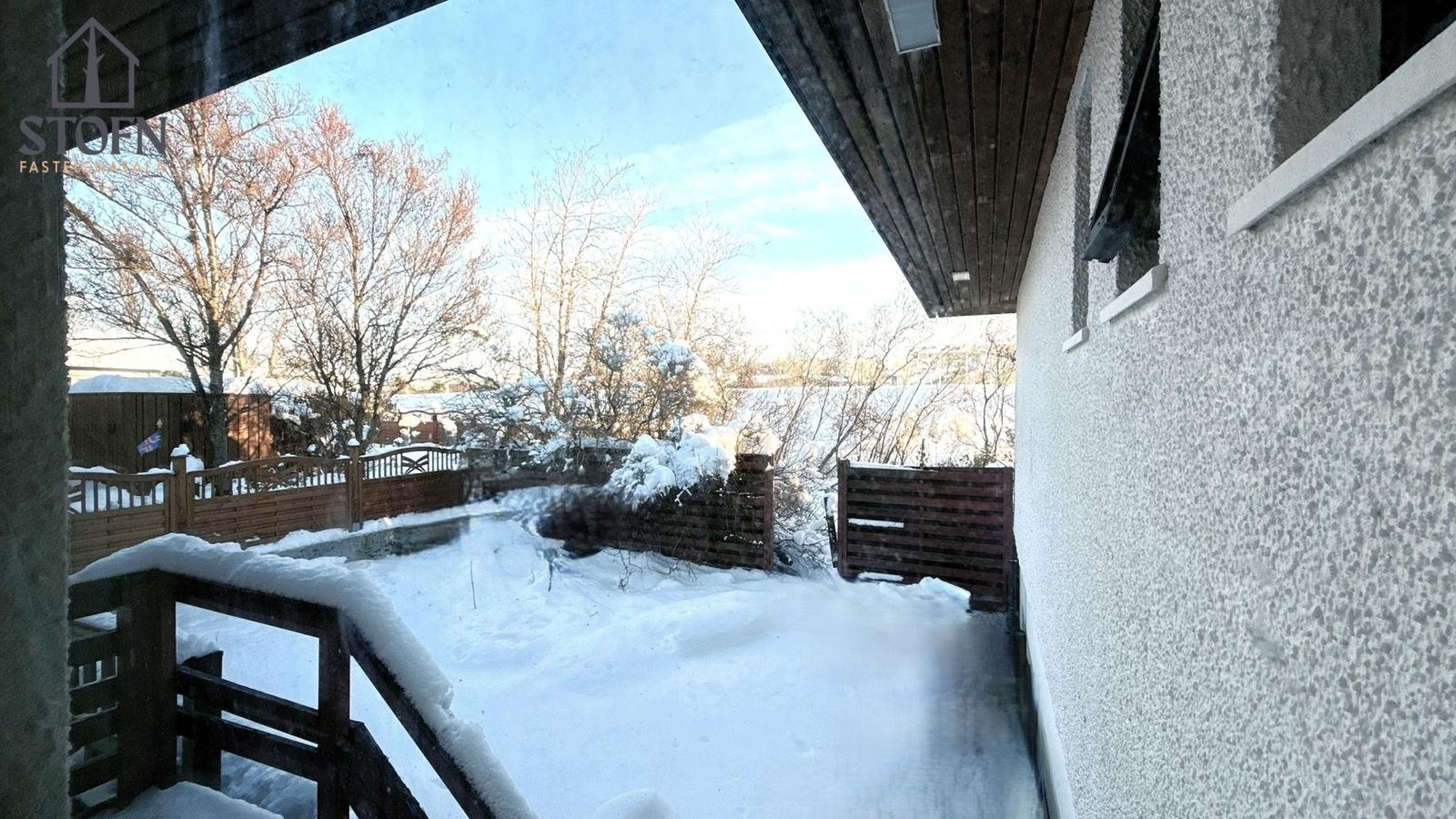Lóð, verönd og bílastæði: Stór timburverönd til suðurs og vesturs með góðu skjóli og sólargangi, margir útgangar. Gróinn garður með fallegum trjágróðri og næði.