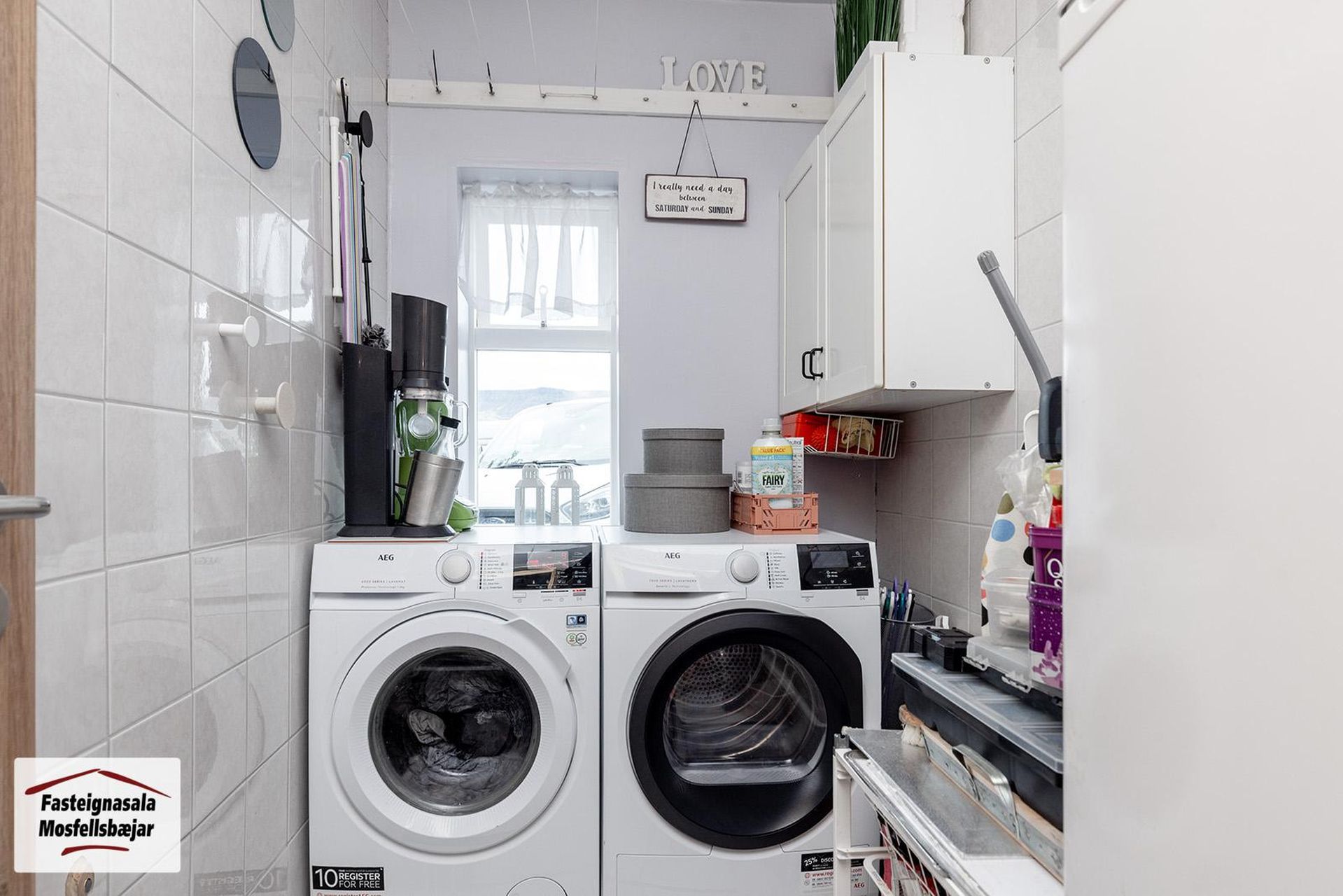 Þvottahús er inn af gangi með tengi fyrir þvottavél og þurrkara. Gluggi er á þvottahúsi.