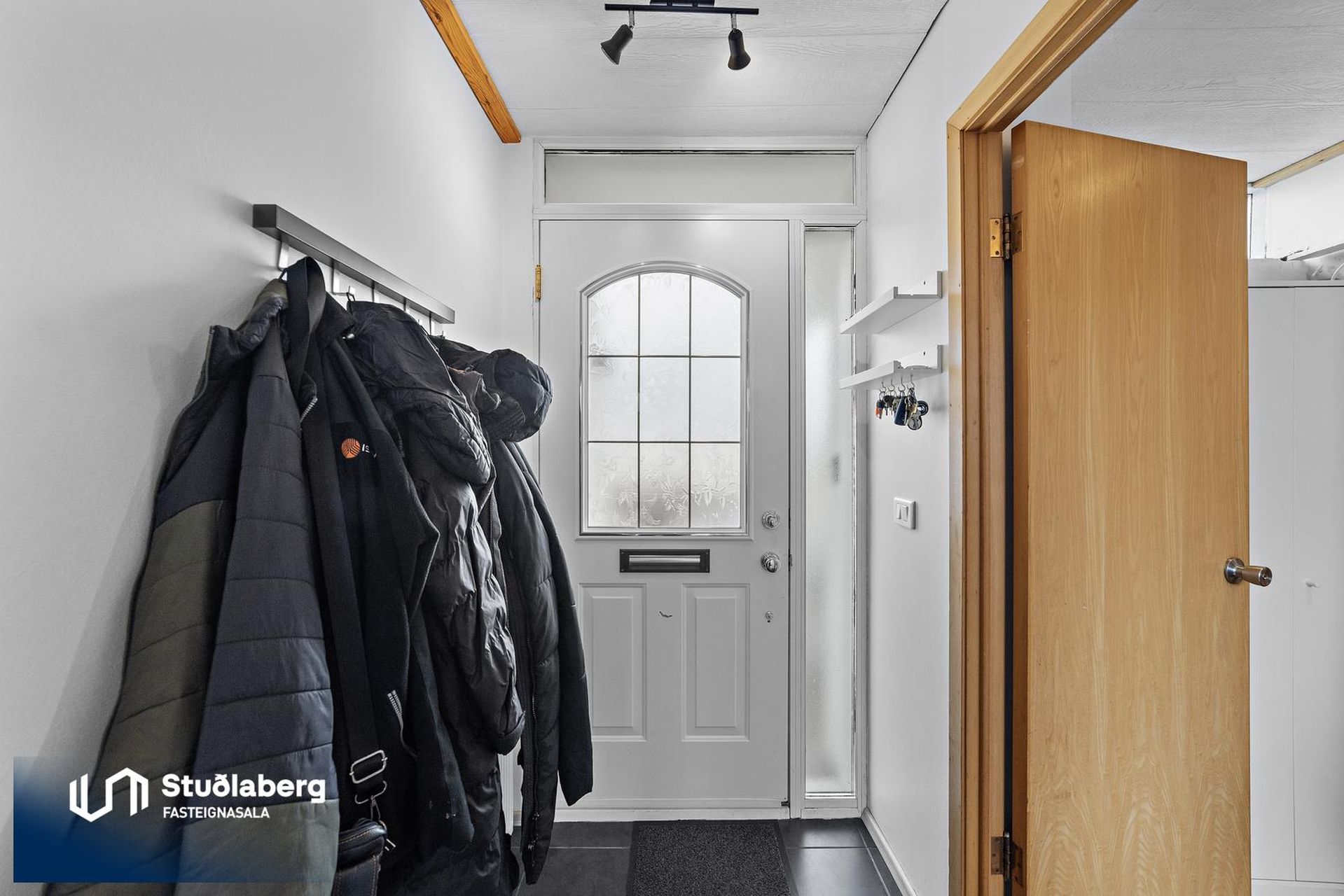 Hol er parketlagt og hurð er út á stórar svalir frá holi sem er yfir bílskúr
