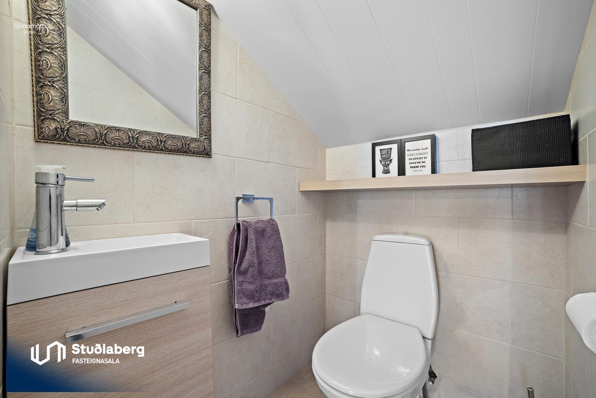 Baðherbergið hefur flísalagt gólf og veggi að hluta. Eikarinnrétting, upphengt salerni og rúmgóð sturta.