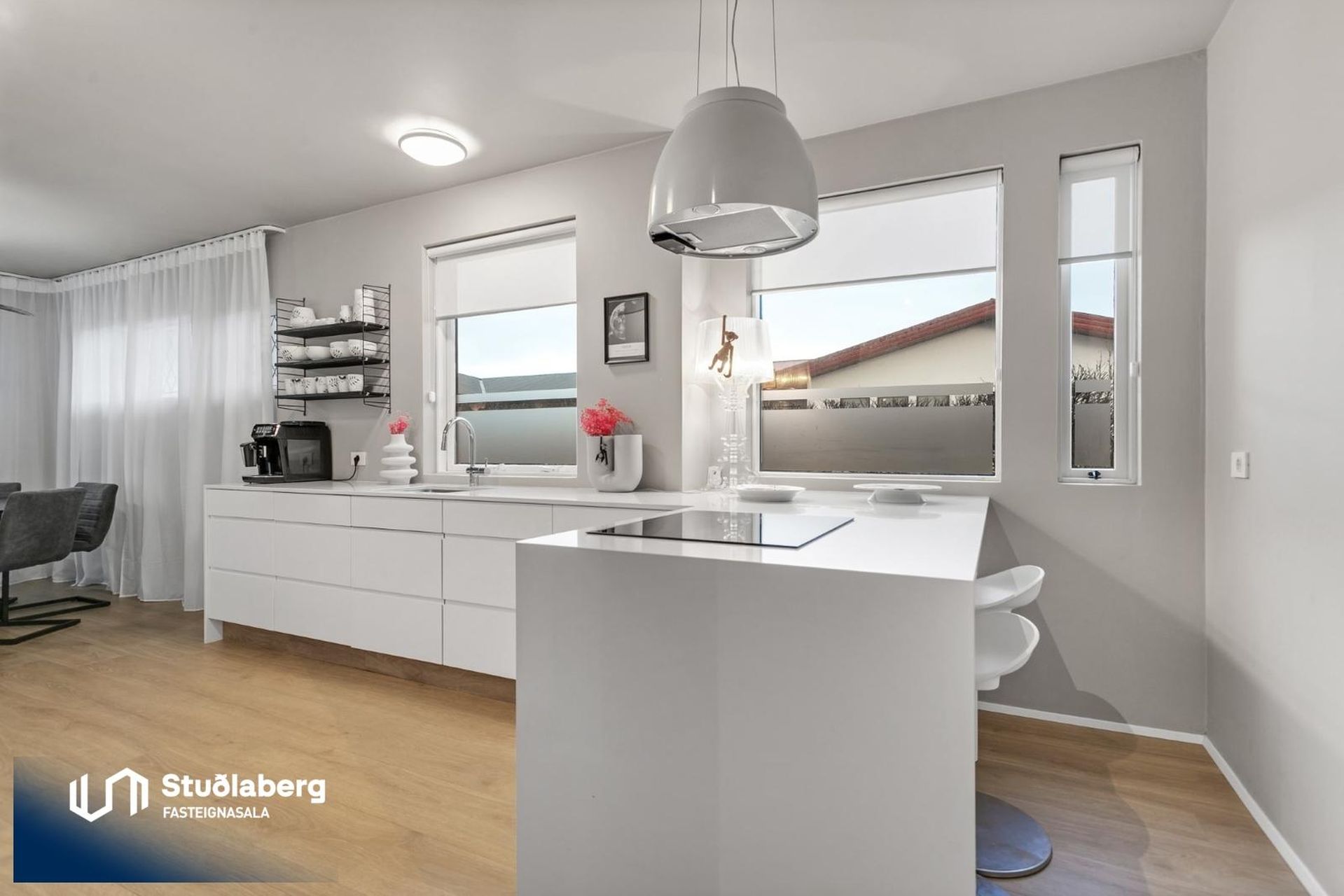 Stofa og borðstofa hafa parket á gólfi