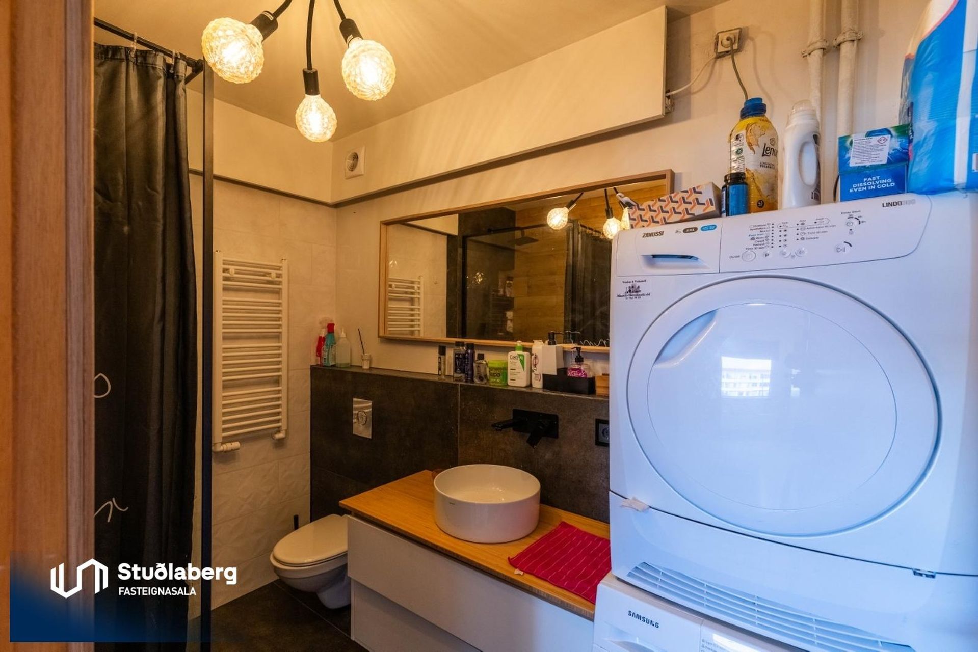 Á baðherbergi eru flísar á gólfi, þar er góð innrétting, upphengt salerni, handklæðaofn og sturtuaðstaða stúkuð af með gleri. Aðstaða fyrir þvottavél er á baðherbergi.