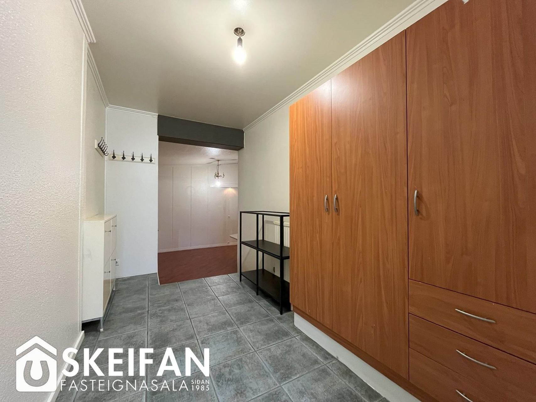 Anddyri: Flísalagt með fataskáp.