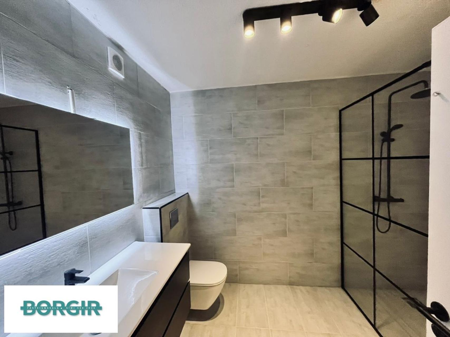 Baðherbergi er flísalagt í hólf og gólf, walkin sturta og upphengt salerni.