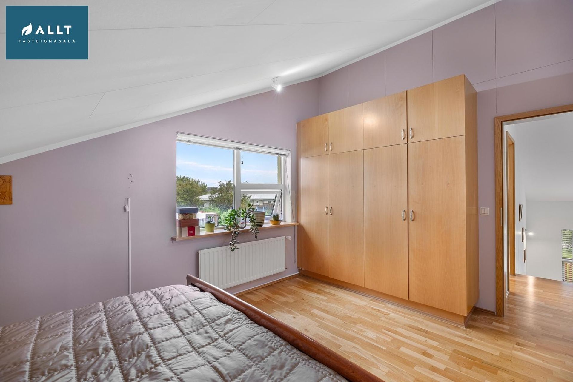 Komið er upp bjartann parketlagðan stiga á efri hæð hússins. Þar eru þrjú mjög rúmgóð svefnherbergi með góðu skápaplássi. Baðherbergi er einnig á efri hæð, þar er baðkar og sturta.