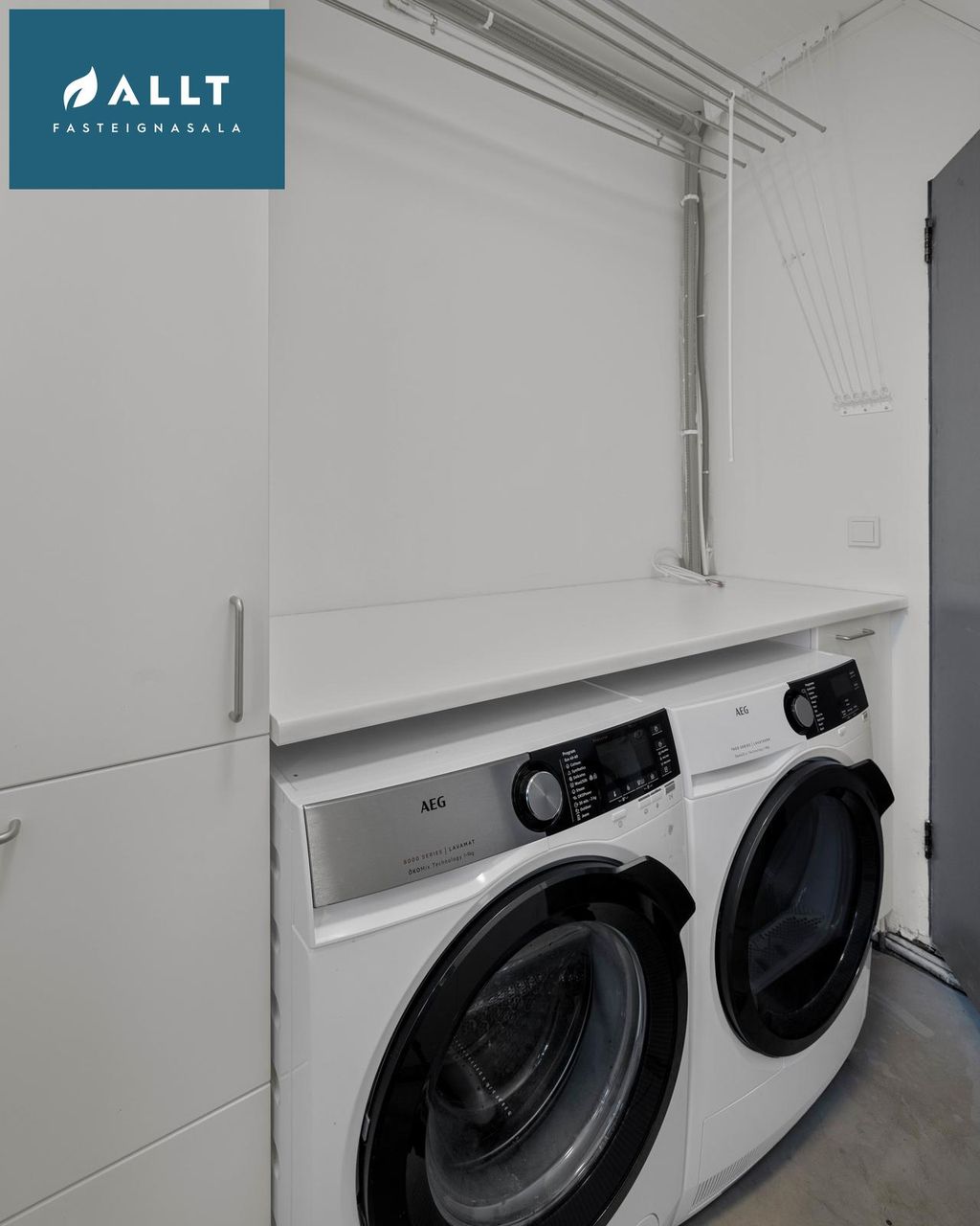 Þvottahús: Nýleg hvít innrétting. Gluggi með opnanlegu fagi.