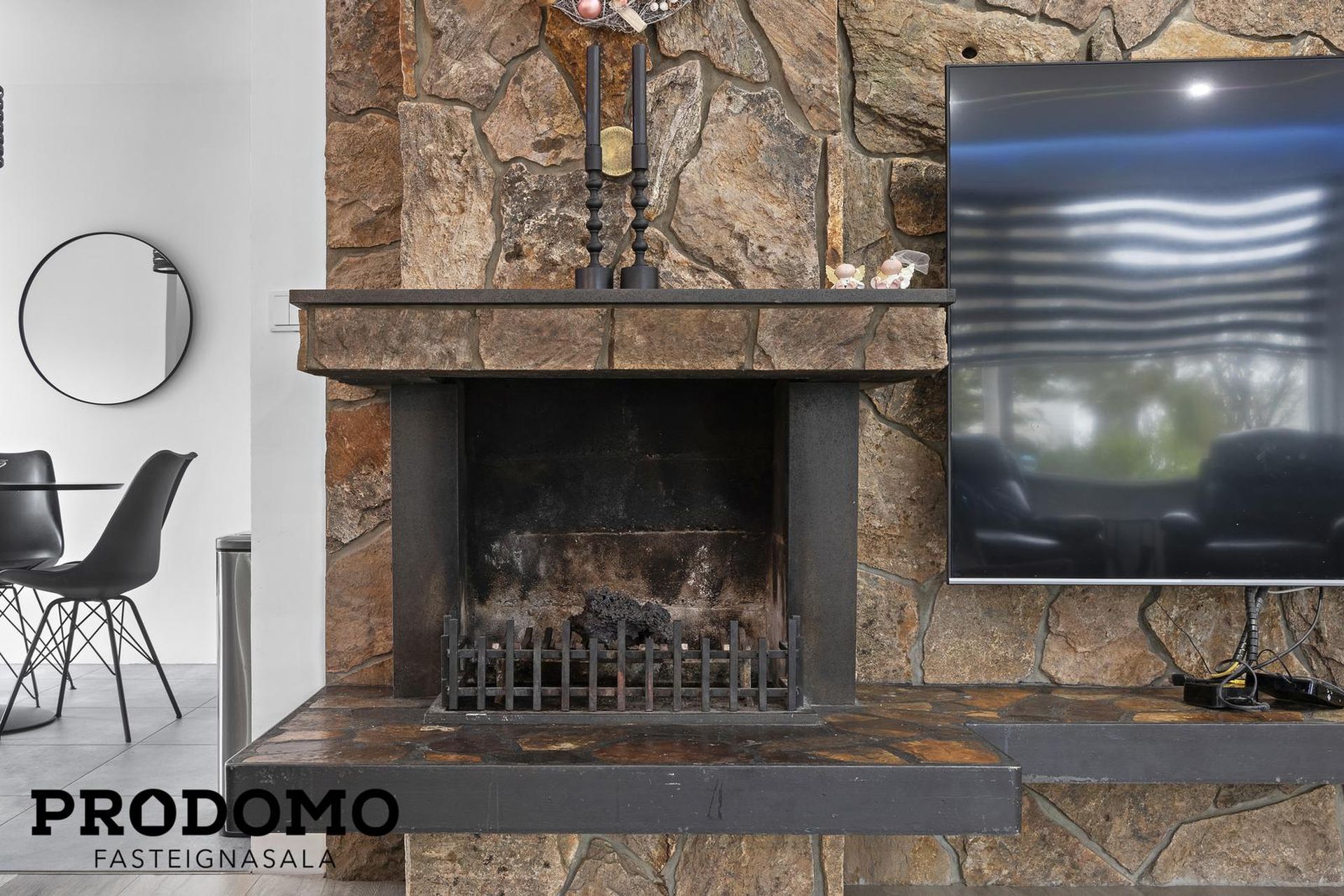 Stofa með nýlegu parketi á gólfi og arinn í stofu.