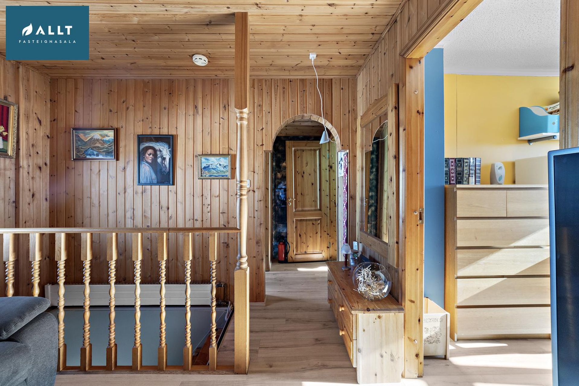 Rúmgott og vel við haldið fjölskylduhús á tveimur hæðum og 45 fm kjallara sem er óskráður. Frábært útsýni, stór pallur og rúmgóður bílskúr. Eignin stendur á 375fm eignarlóð með malbikaðri innkeyrslu og afgirtum garði.