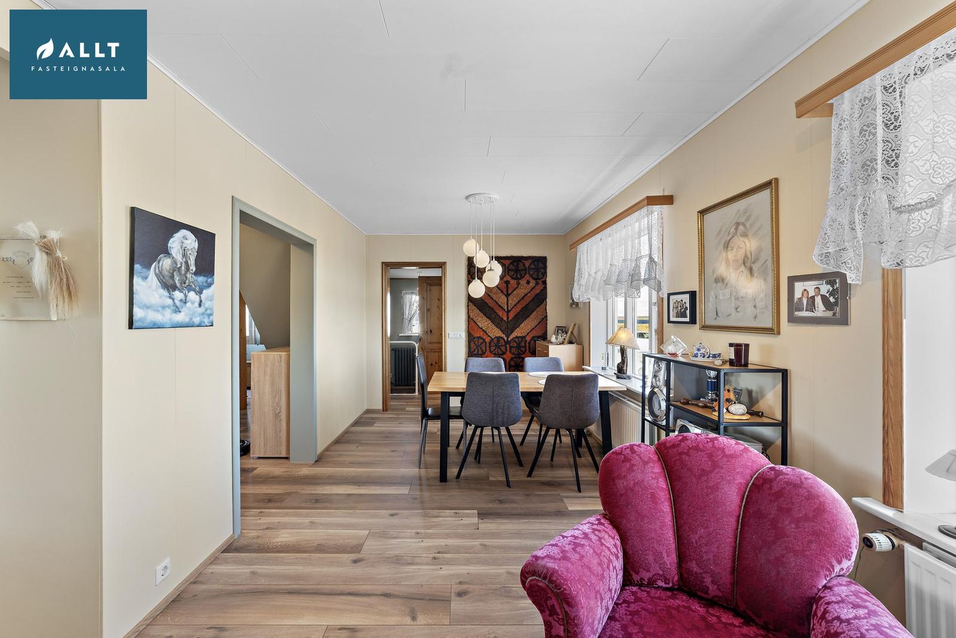 Borðstofa og stofa: Samliggjandi rými með parketi. Rýmin hafa verið opnuð frá upprunalegu skipulagi. Nýlegir ofnar.
