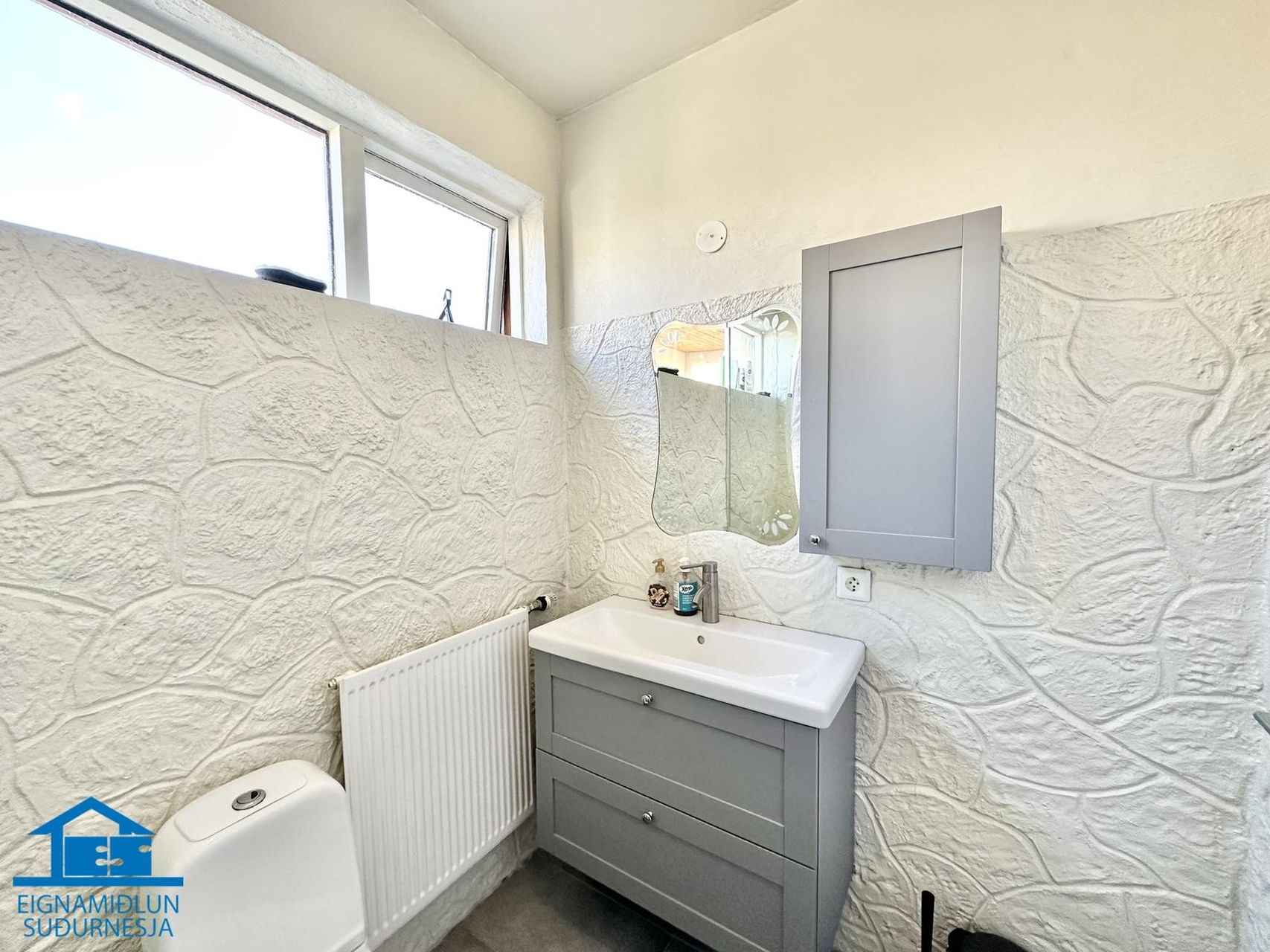 Baðherbergi hefur flísar á gólfi og á veggjum að hluta, sturta, handklæðaofn, salerni, innréttingu með handlaug og speglaskáp yfir innréttingu. Opnanlegur gluggi er yfir sturtu. Tengi er fyrir þvottavél og þurrkara.