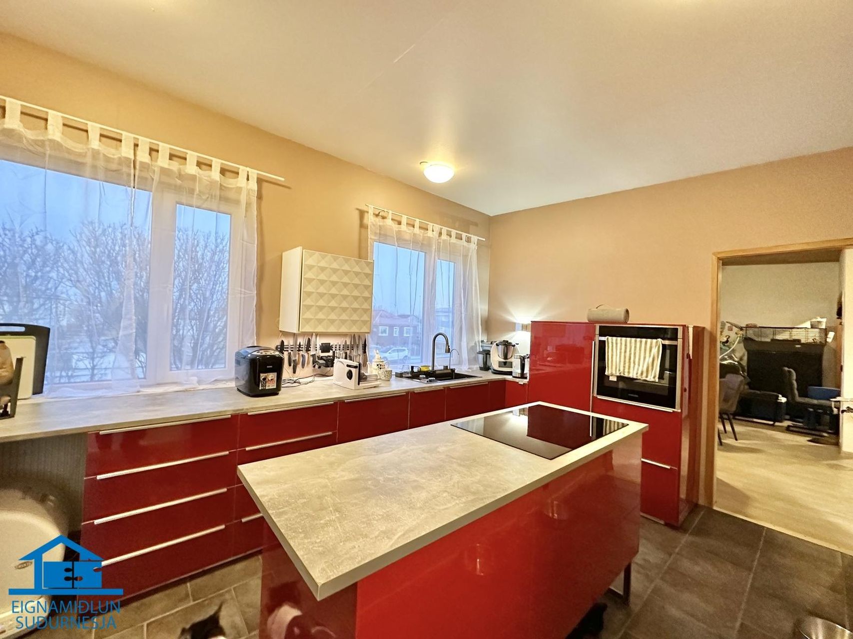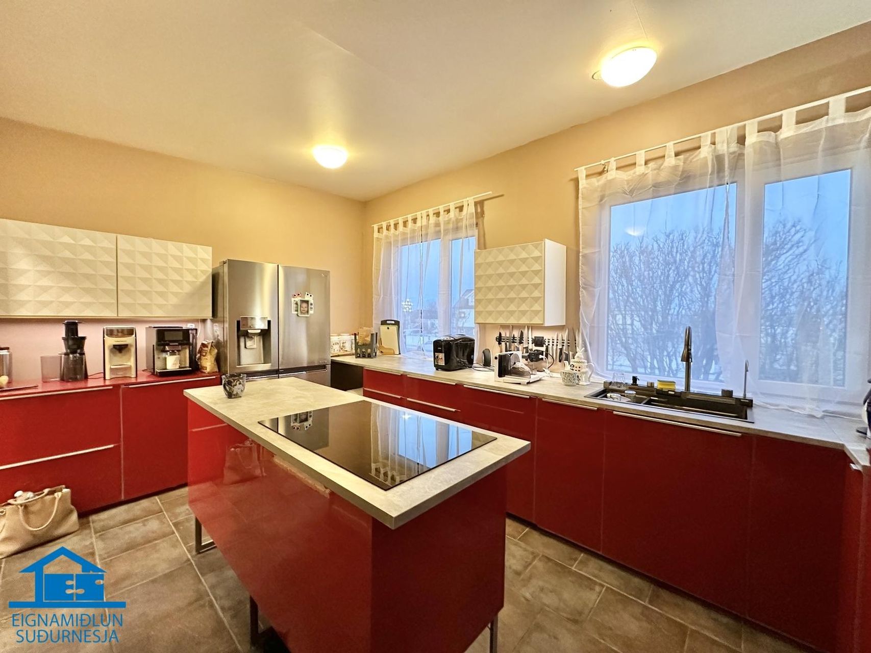 Eldhús hefur flísar á gólfi, góð innrétting með miklu skápaplássi og eldhúseyja með helluborði.
