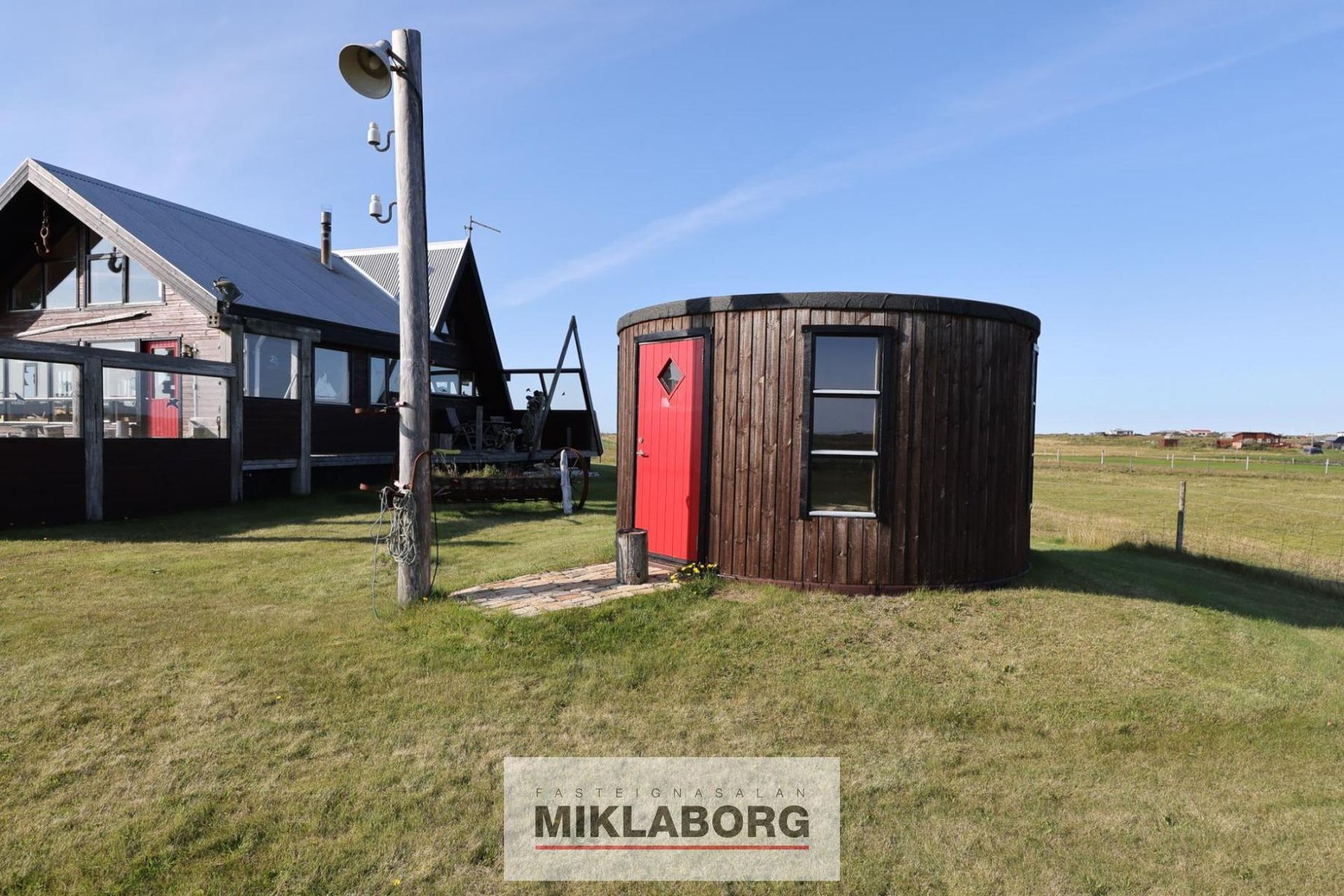 500 fm landið er til hiðar við gamla A húsið, næst sjó. Á því landi er áhaldahús, ca 20 fm sem er í raun gamall olíutankur sem fengið hefur nýtt hlutverk. Þakið er tyrft og einangrunargildi hússins ágætt. 725 fm skikinn er með fallegum húsakosti sem einnig er að mestu eldri olíutankur en fram við hann hefur verið komið fyrir forstofu. Virkilega sjarmerandi húsakot með stofu og eldhúsi sitt hvorum megin. Veggir málaðir með listaverkum. Parket er á gólfi panell í lofti forstofunnar. Húsið er rúmlega 50 fm. Á lóðunum hefur nýlega verið byggður turnhús sem er þó ekki fullklárað. Þar væri t.a.m. hægt að koma upp snyrtiaðstöðu eða jafnvel gufu. Ca. 8-10 fm