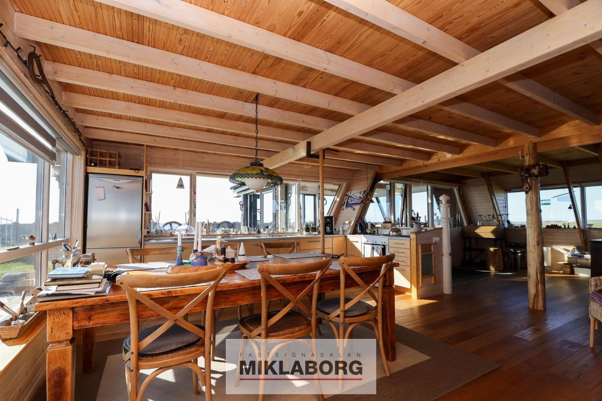 A húsið í landi Miðkots stendur næst sjó með grjótvarnargarði á milli. Húsið er byggt upprunalega 1977 en hefur síðan þá gengið í gegn um töluverðar endurbætur m.a. hefur verið bætt við húsið á annarri hlið þess stóru rými sem er með svefnlofti yfir. Annars samanstendur neðri hæðin af stórri notalegri stofu, eldhús með miklu skápaplássi m.a. með stæði fyrir uppþvottavél og ísskáp. Borðstofa er staðsett fyrir framan eldhús og er með nægu rými. Baðherbergi með sturtuklefa og þar er pláss fyrir þvottavél. Farið er upp stiga til að komast upp á svefnloft sem er mjög rúmgott og bjart. Í dag eru þar þrjú rúmstæðí, hvert fyrir sig opið. Eitt þeirra er við endagafl hússin með stórfenglegu útsýni út á haf, sannkölluð svíta. Fyrir ekki svo löngu var bætt við bislag sem er hellulagt og um er að ræða óskráð fermetra sem eru ca 20-25 fm. Húsið er kynnt með varmadælu og kamínu og parket er á gólfum utan baðherbergis sem er flísalagt.