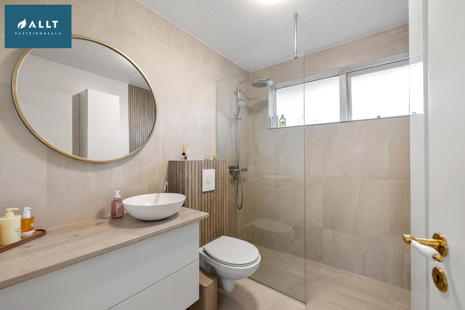 Baðherbergi: Ný tekið í gegn með walk inn sturtu og nýjum flísum