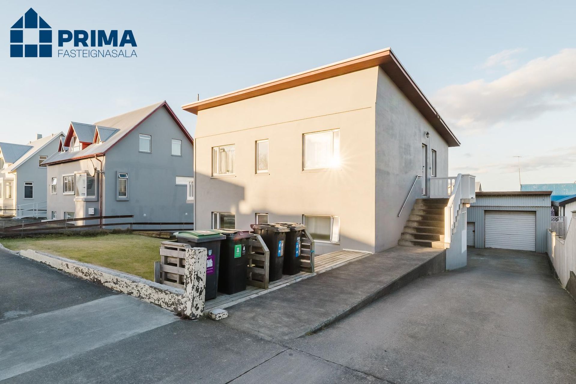 Verönd hjá bílskúr.