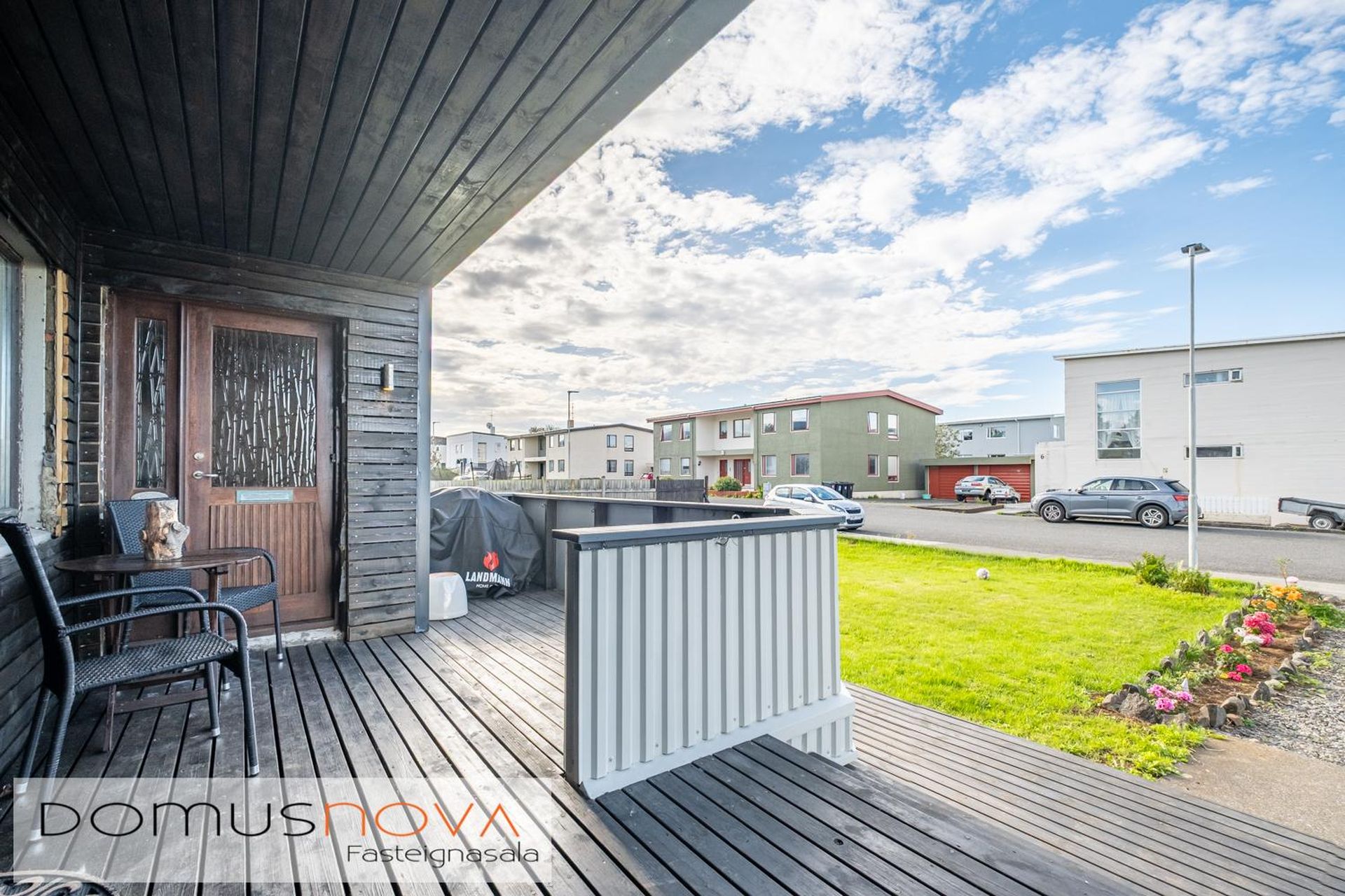 Timburverönd við sér inngang.