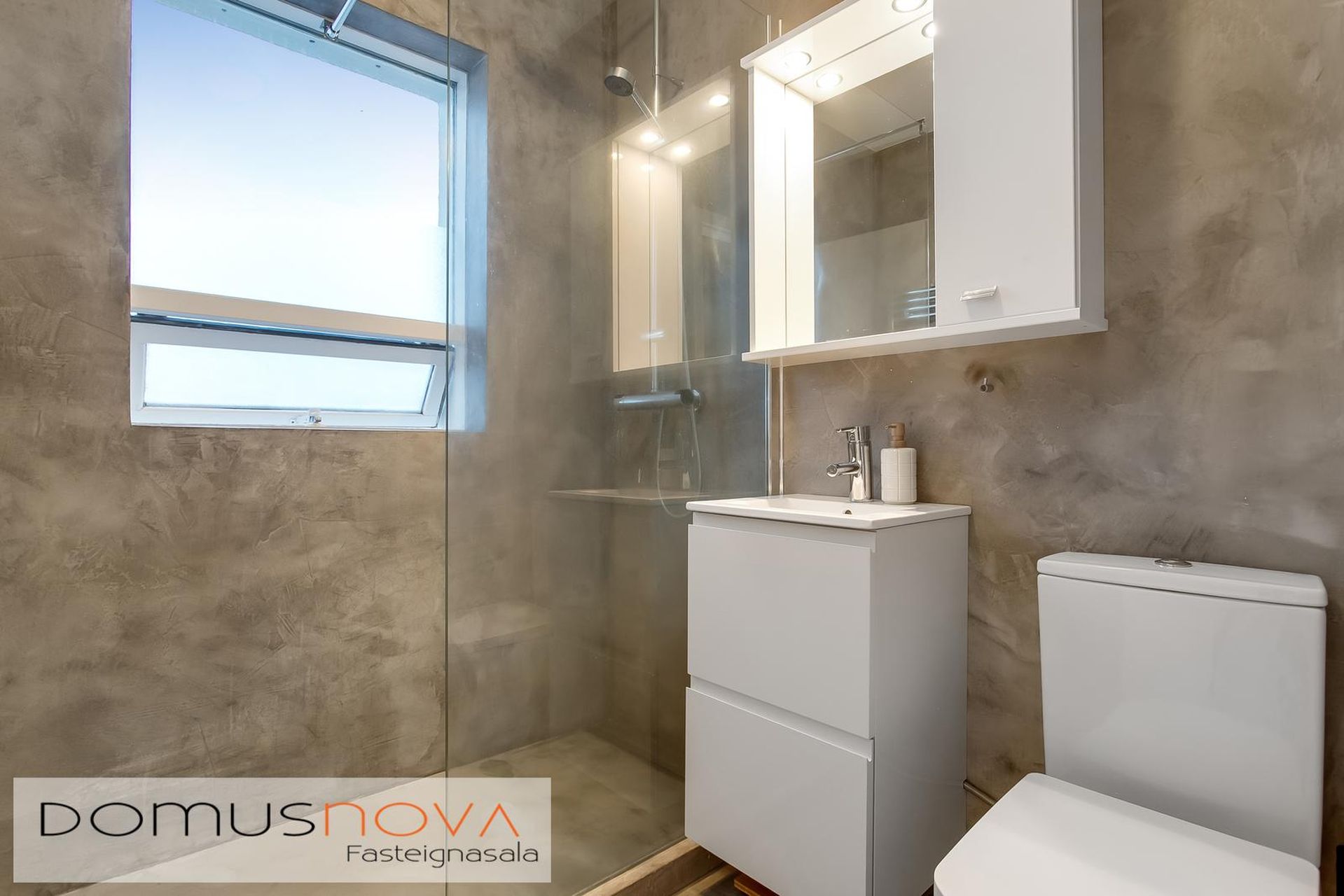 Baðherbergi lakkað mikrosement á gólfi og veggjum, skápar, handklæðaofn, sturta afstúkuð með glervegg.