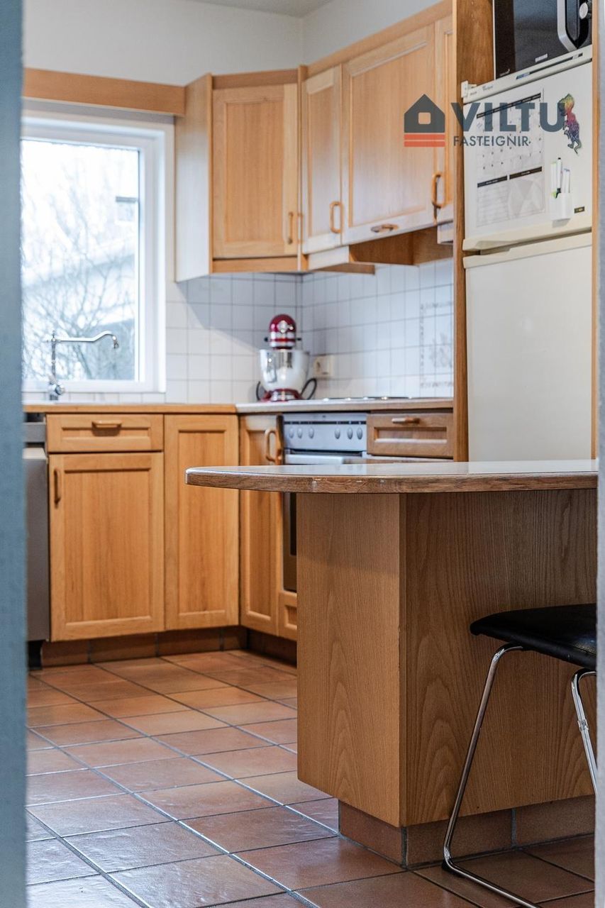 Eldhús er með viðarinnrétting, flísar á milli skápa, helluborð, ofn, vifta, uppþvottavél. Flísar eru á gólfi.