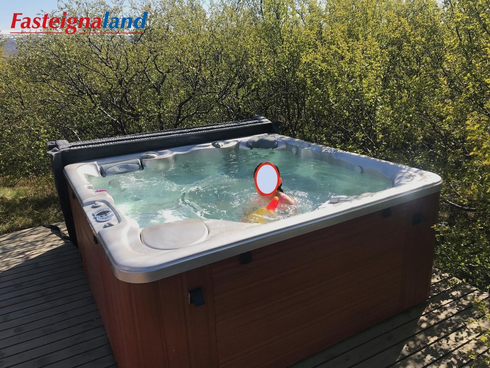 Sólpallur: stór pallur við húsið og þar er heitur rafmagnspottur. Góð aðstaða fyrir grillið, yfirbyggt og hægt að loka.