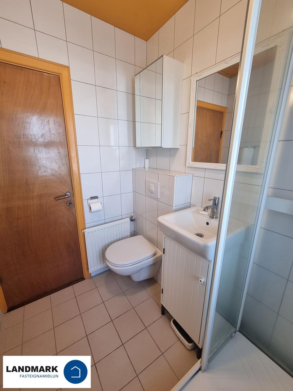 Baðherbergið er flísalagt með sturtuklefa og fallegri innréttingu.