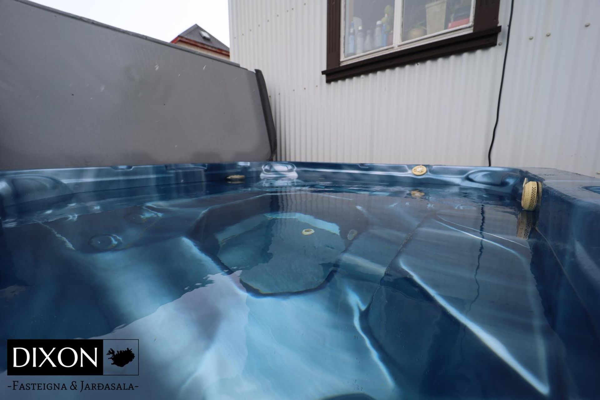 * Sólpallur með heitum pott á baklóð hússins.
